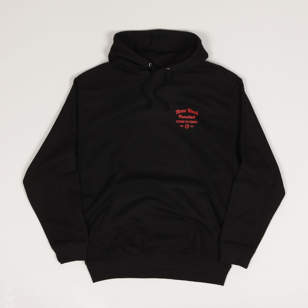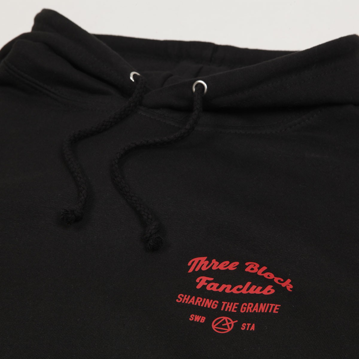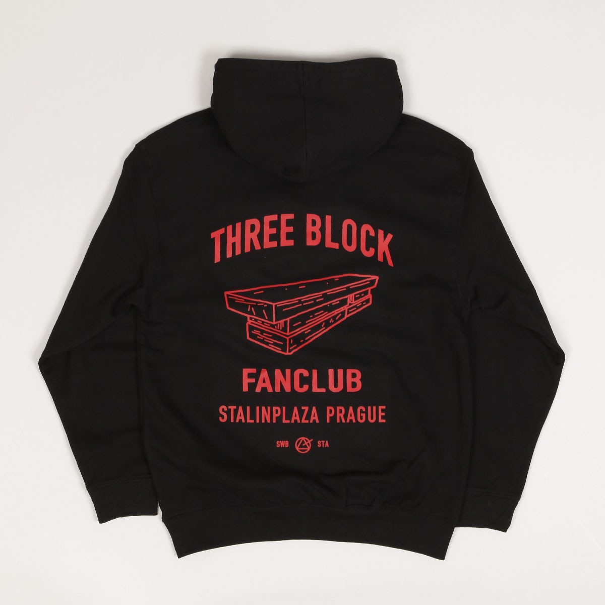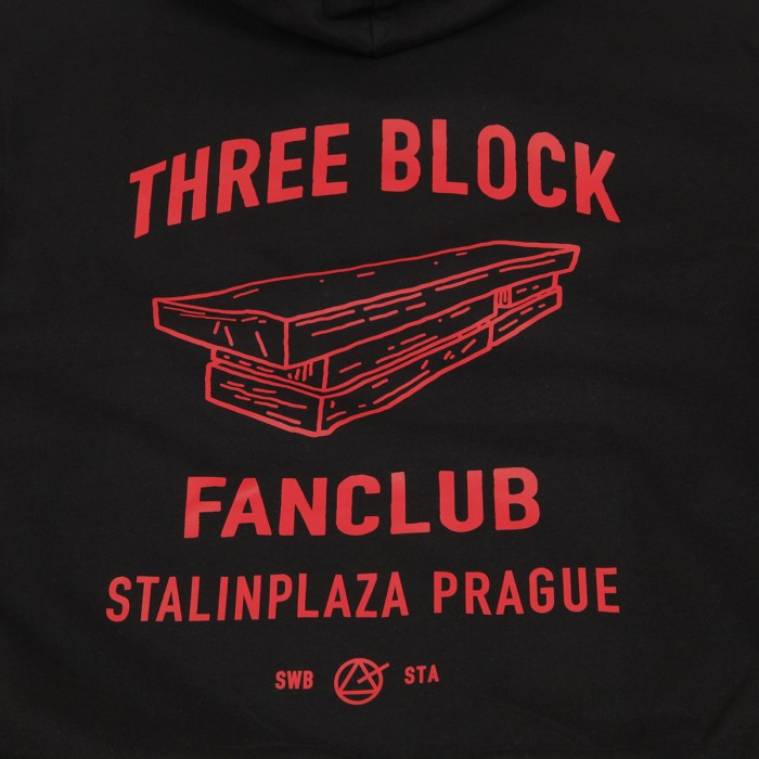 Mikina Skate World Better s názvem TBF - Three Block Fanclub Hoodie v černé barvě. Grafika vzdává hold notoricky známe trojce ze Stalina. Na levé straně prsou malý a na zádech velký nápis Three Block Fanclub s motivem stalinské trojky. Pod grafikou potisk Stalinplaza Prague. Vyrobeno z 80% bavlny a 20% polyesteru.