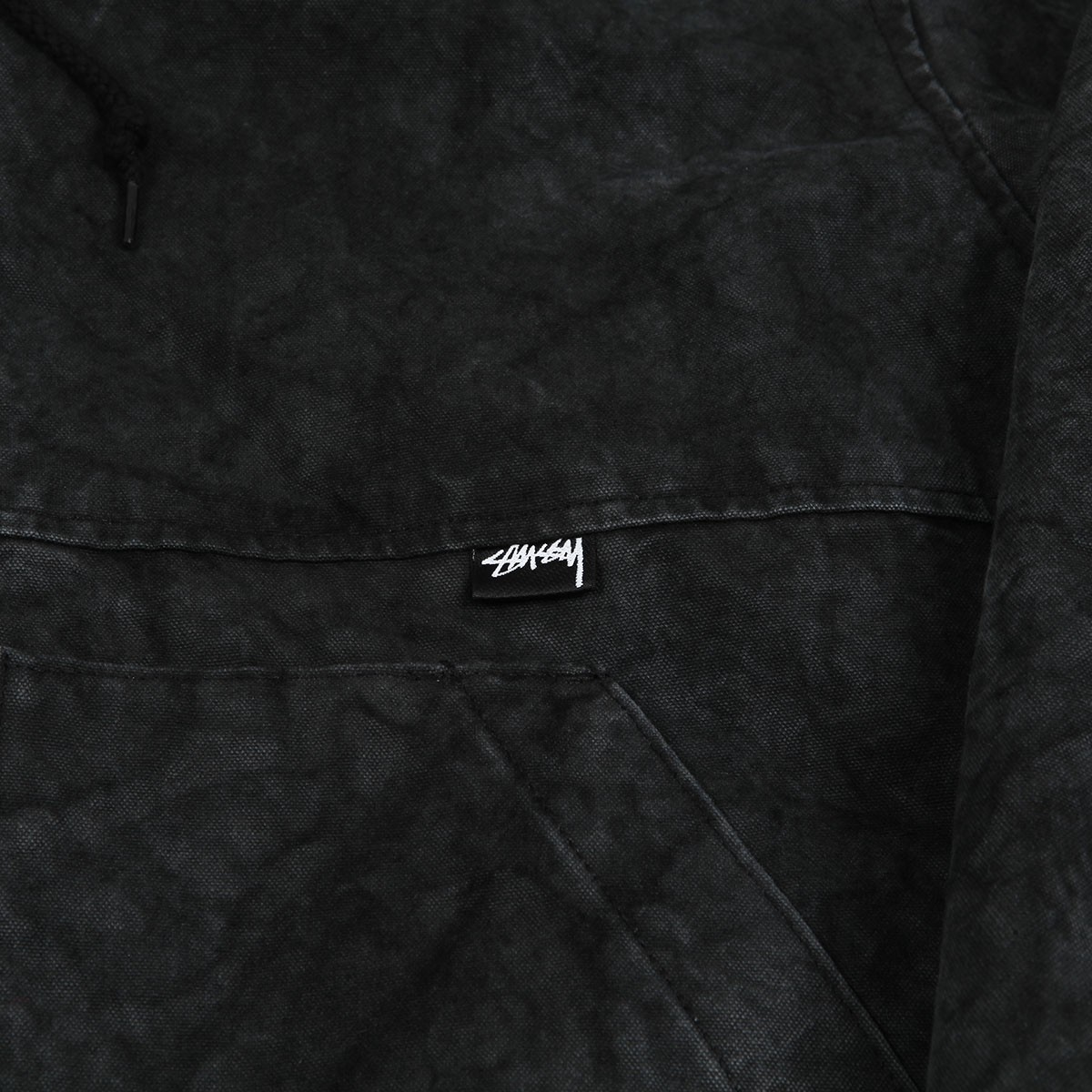 Bunda Stussy, model s názvem Washed Canvas Insulated Jacket v seprané černé barvě má nad levou kapsou našitou malou decentní vlaječku s logem Stussy, zapínání na zip, kapuca se stahováním na tkaničky a dvěma předními kapsami na drobnosti. Materiál je z 100% bavlny.