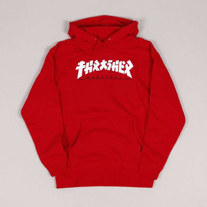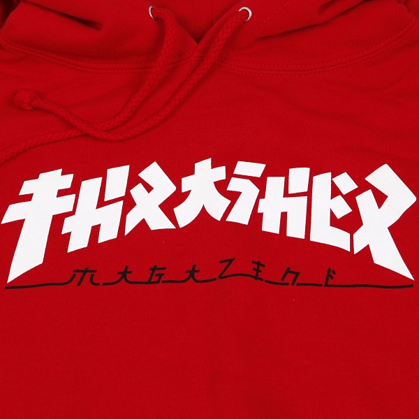 Mikina z limitované kolekce značky Thrasher. Střih mikiny je "regular fit". Stahovatelná kapuce, na prsou natištěné logo časopisu Thrasher Skatemag upraveného do japonského písma v kontrastním bílo-červeném provedení , přední velká kapsa.