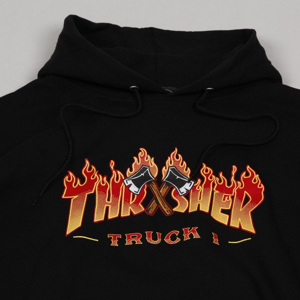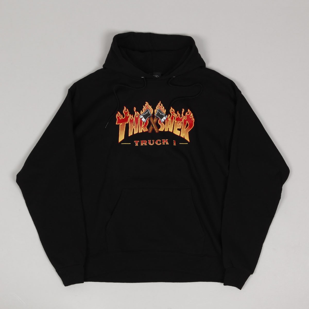 Mikina Thrasher v černé barvě s názvem Truck 1 Hoodie. Střih mikiny je "regular fit". Stahovatelná kapuce, na prsou natištěné logo Flame časopisu Thrasher se sekerami a nápisem Truck 1.