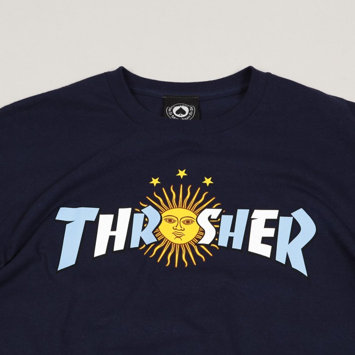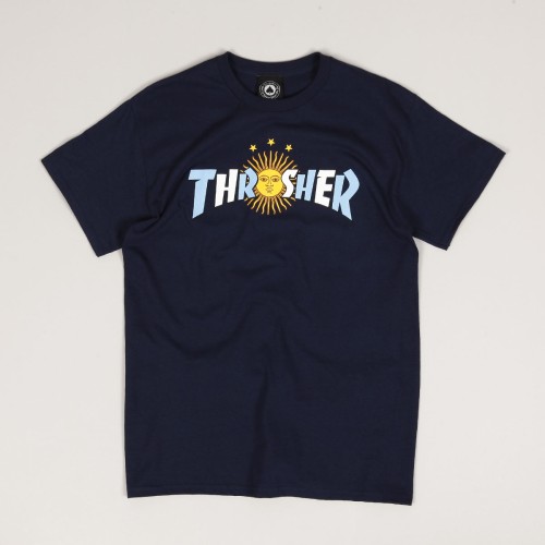 Triko Thrasher Magazine s názvem Argentina Tee v tmavě modré barvě. Materiál 100% bavlna. Klasický střih REGULAR s krátkými rukávy. Na prsou potisk loga Thrasher upraveného do podoby argentinské vlajky. Grafiku vytvořil Tony Vitello, který tak vzdává hold svému otci pocházejícímu z Argentiny a také fotbalu. Tři hvězdy nad grafikou symbolizují tři vítězství ve FIFA World Cup z let 1978, 1986 a 2022.