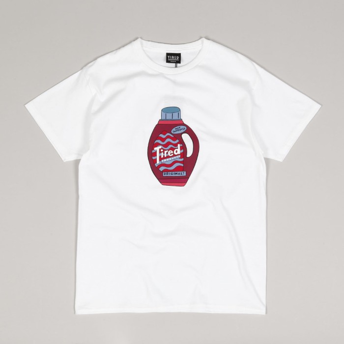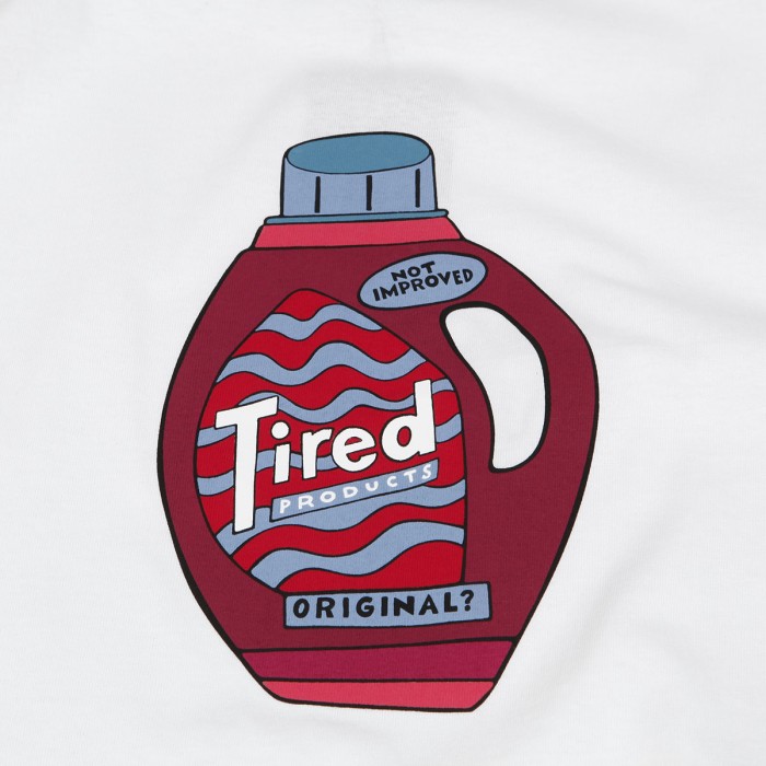 Triko Tired Skateboards, model s názvem Detergent Tee White. Na prsou natištěná barevná grafika čistícího prostředku s logem Tired. Vyrobeno ze 100% bavlny. Tired Skateboards, značka založená známým umělcem Pietem Parrou a jeho kamarádem, skaterem Bradem Stabou. Jejich grafiky se nesou v retro stylu 70. let, pastelových barvách a abstrakci.
