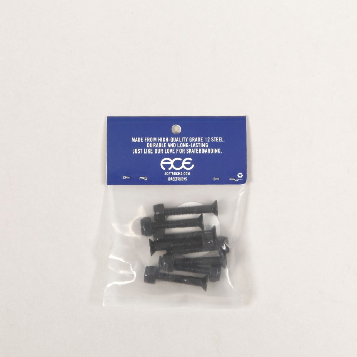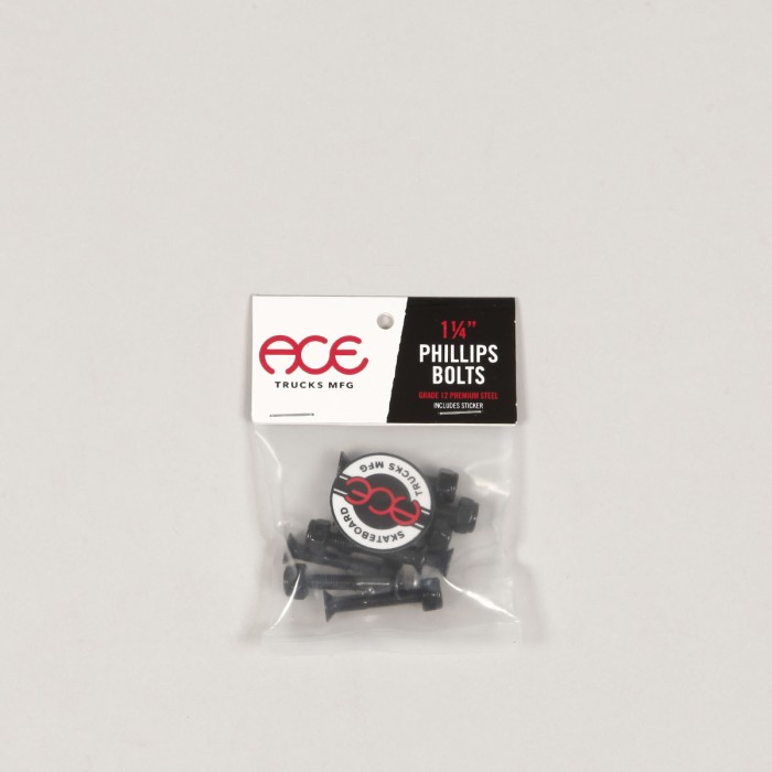 Šroubky od značky ACE s názvem Phillips Bolts s hlavičkou na křížový šroubovák. V balení 8ks černých šroubků, 8ks matiček a dvě samolepky ACE. Velikost 1 1/4" palce. Jsou vyrobeny z vysoce kvalitní oceli třídy 12. Jsou velmi odolné.