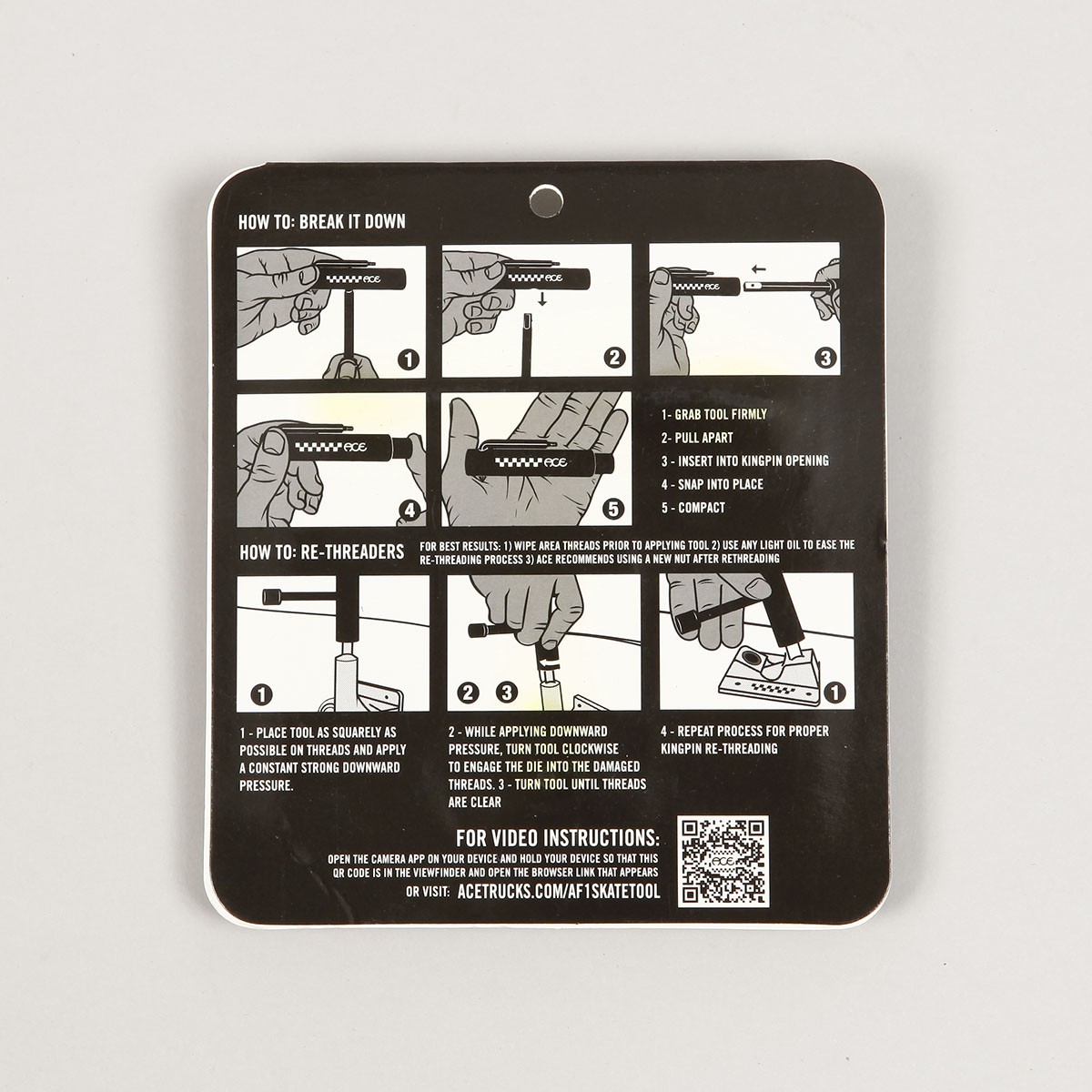 Nářadí na skate značky ACE Trucks s názvem AF1 Skate Tools v černé barvě s šedým nápisem AF1 ACE. Celokovové provedení, obsahuje imbus a křížový šroubovák, 10, 13, a 14 milimetrové klíče na utakování matiček. Navíc jsou v balení dva závitníky ve velikosti 13 a 14 milimetrů k obnově závitu na ose a kingpinu. Téčko lze rozebrat, aby se ti bez problému vešlo do kapsy.