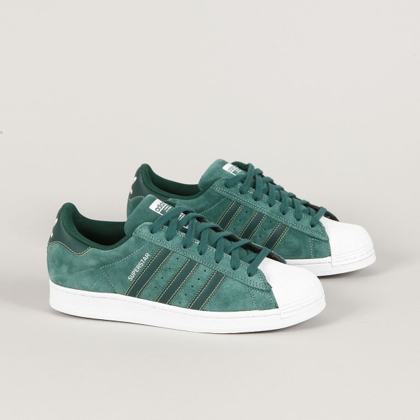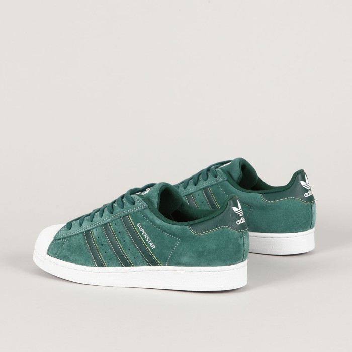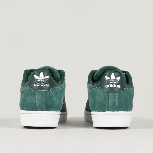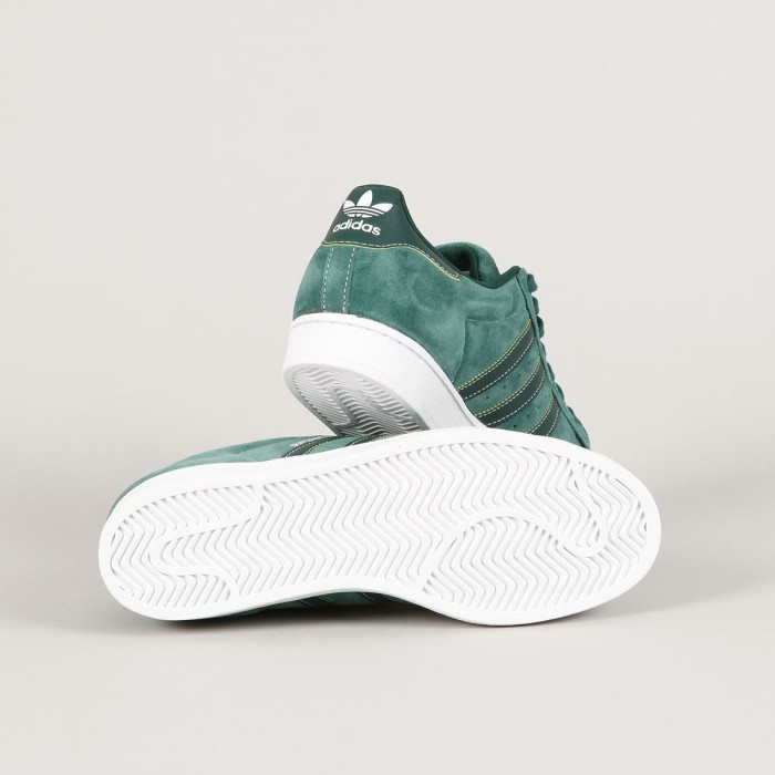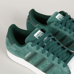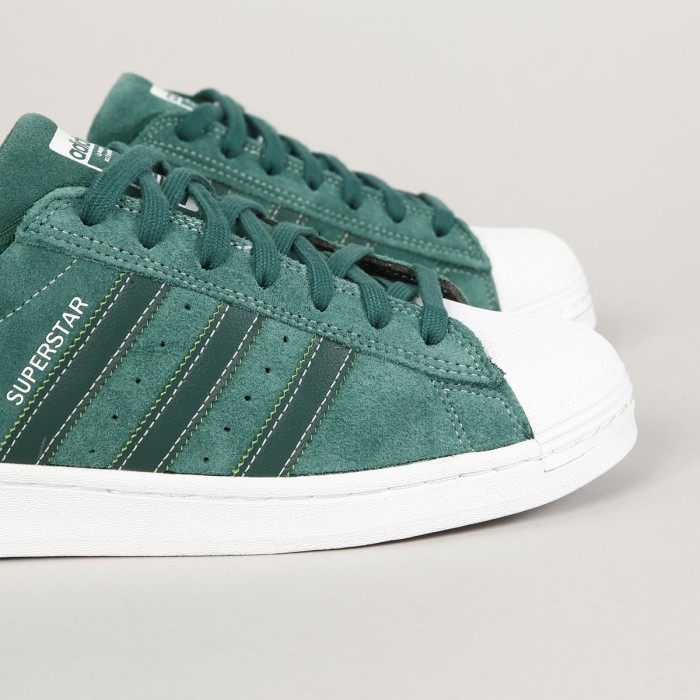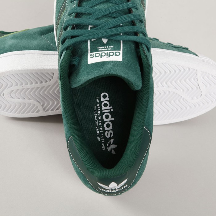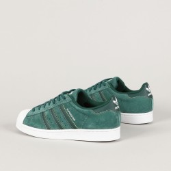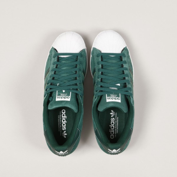 Boty Adidas Skateboarding, model Superstar ADV v barevném provedení Collegiate Green Cloud White. Svršek ze semiše se zesílenou gumovou špičkou "shelltoe" a velmi pohodlnou, speciálně tvarovanou vnitřní vložkou Adiprene. Polstrovaný vnitřní lem patky, na patce kožené logo Adidas a na jazyku logo Adidas Skateboarding. Elastický klínek na jazyku zajišťuje dokonale padnoucí střih, pro lepší kontakt s prknem a jeho ovládání. Z boku tři ikonické pruhy Adidas a nápis Superstar.