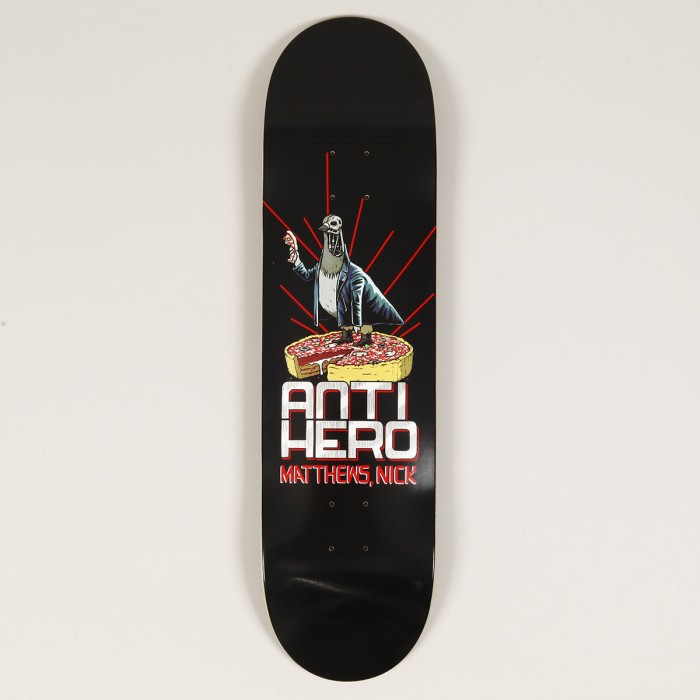Deska Antihero s názvem P2: Judgement Day, pro model ridera Nicka Matthewse, velikost desky 8.38 palců. Grafika holuba stojícího na koláči, který je inspirován filmem Terminator 2 Judgement Day. Signatura Nicka a logo Antihero pod ní. Grafiku vytvořil Todd Francis. Ke každé desce grip zdarma. Vrchní barvená strana desky se může lišit oproti fotce.