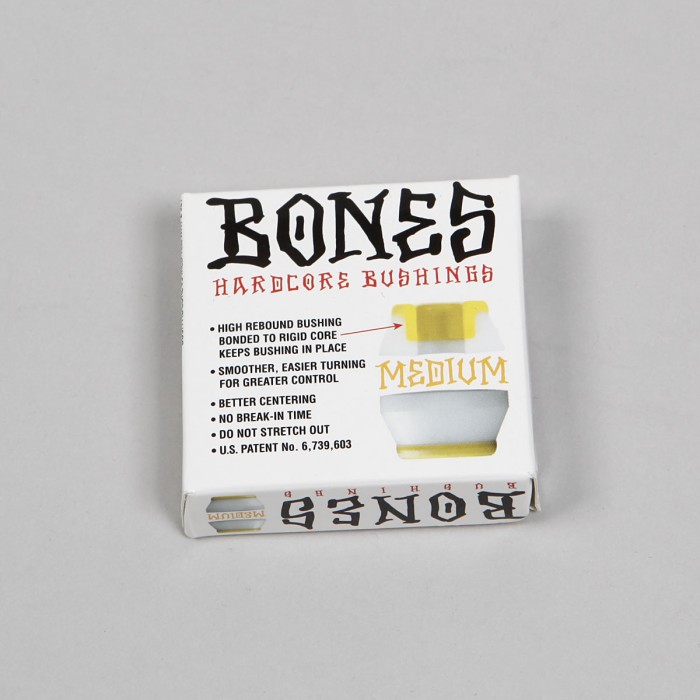 Silentbloky od značky BONES s označením Medium, tedy středně tvrdé. Mají uretanové pouzdro a lépe drží treky na středu, poskytují lepší kontrolu a dobře se s nimi zatáčí. V balení jsou 4 kusy.