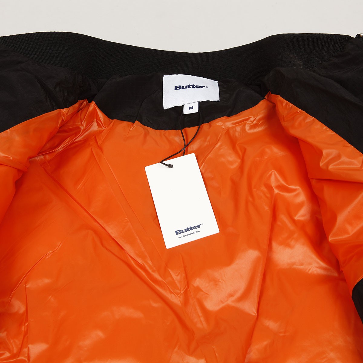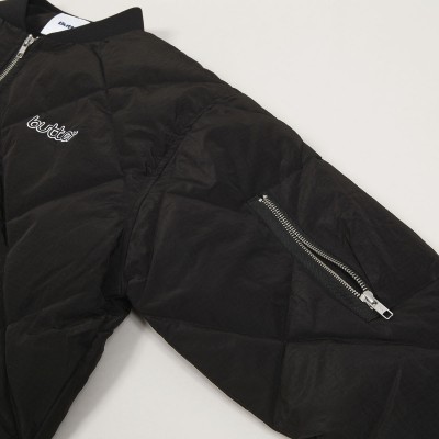 Slabší péřová bunda Butter Goods, model s názvem Alpine Bomber Jacket v černé barvě má zapínání na jednocestný zip. Střih bomberu, vyšší límeček, zúžené rukávy a elastický pas. Po stranách dvě kapsy a jedna na rukávu se zapínáním a uvnitř skrytá kapsa na prsou. Na prsou decentní výšivka nápisu Butter. Vyrobeno ze 100% polyesteru - ripstop. Z aktuální kolekce australské značky Butter Goods, kterou v roce 2008 založili skateři a kamarádi Garth Mariano a Matt Evans.