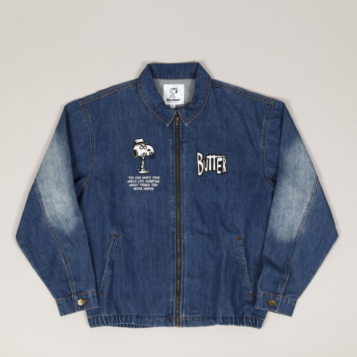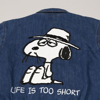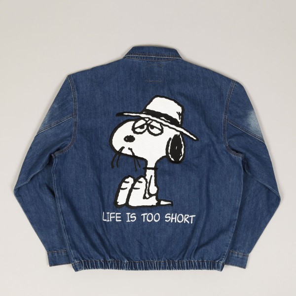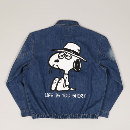 Džínová bunda s vyšitým logem Butter na levé straně prsou. Na zádech má velkou výšivku Snoopyho bratra Spika, který nosí klobouk a knírek. Pod grafikou je slogan "Life is too short". Spika s dalším sloganem najdeš i naproti logu Butter.