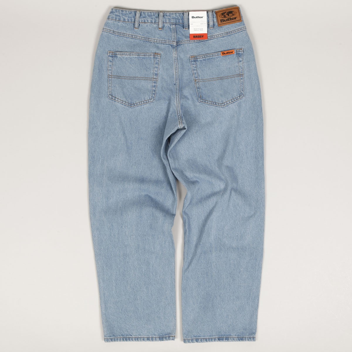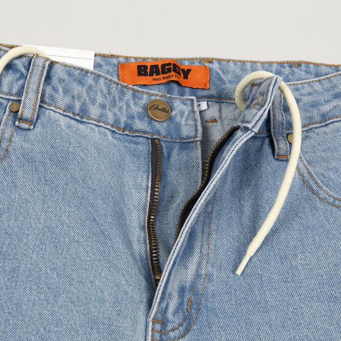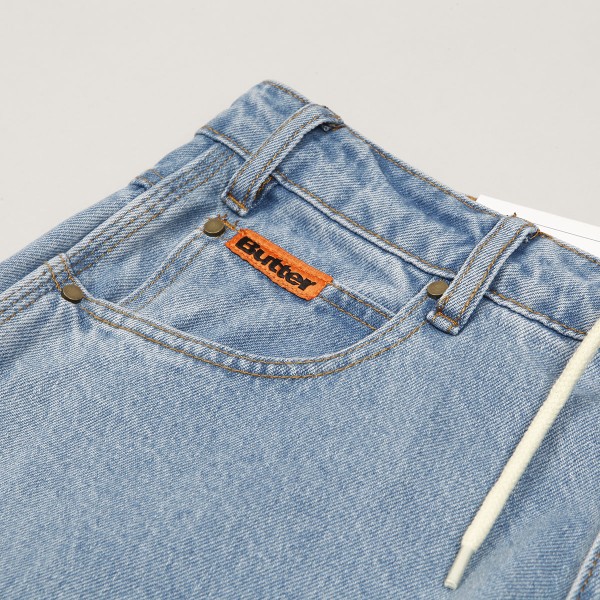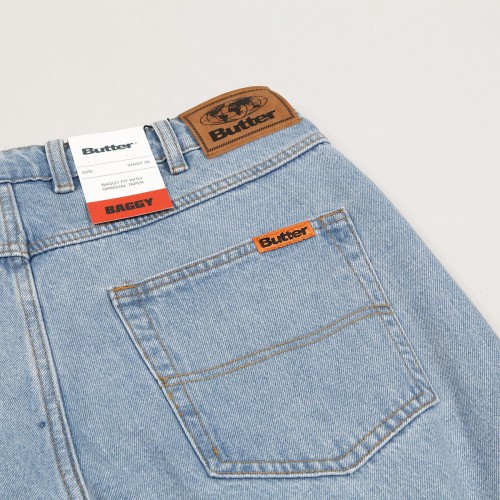 Jeanové kalhoty z kolekce australské značky Butter Goods, kterou v roce 2008 založili skateři a kamarádi Garth Mariano a Matt Evans. Model s názvem Baggy Denim Jeans Pants v seprané tmavě modré barvě s hnědým prošíváním má šíroký Baggy Fit střih. Na přední a zadní kapse kontrastní oranžová nášivka s logem Butter. V pase ukrytá tkanička na stahování. Na horním lemu na pravé straně obdélníková kožená nášivka s vyraženým labelem Butter.