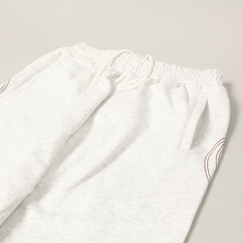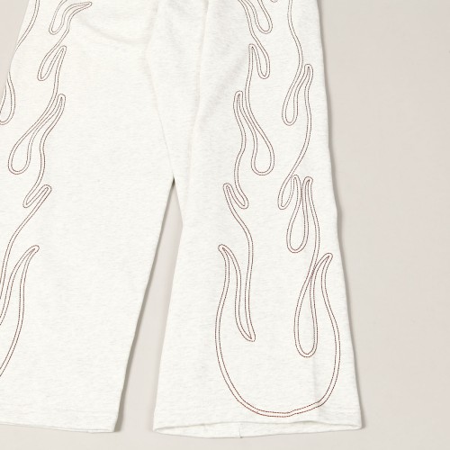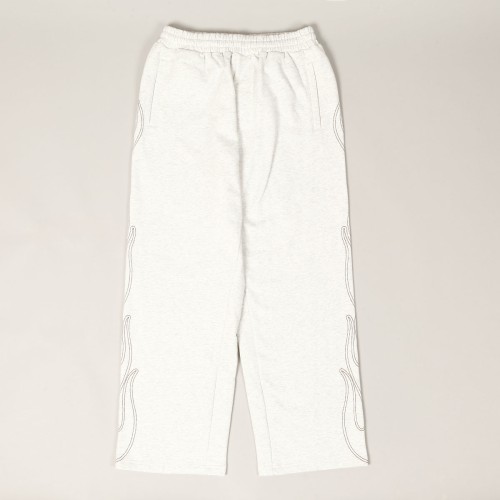 Mají široký baggy střih s mírným zúžením nohavic. Po stranách kapsy s lemováním. Nohavice zdobí výšivka kontrastního plamene po celé délce.
