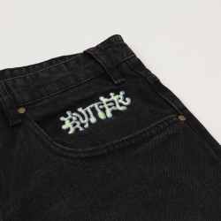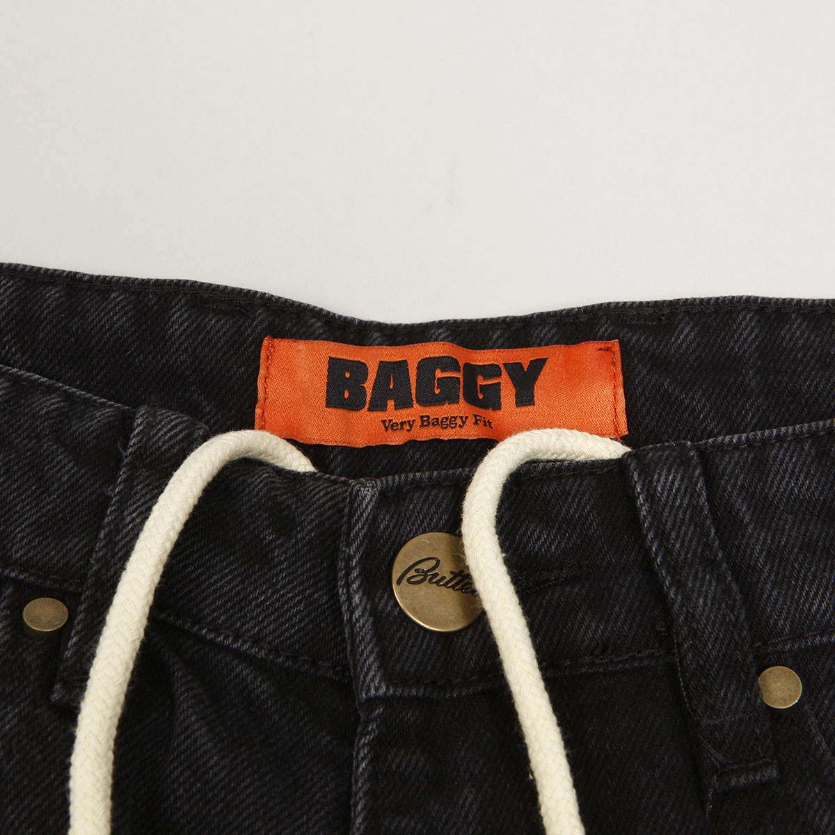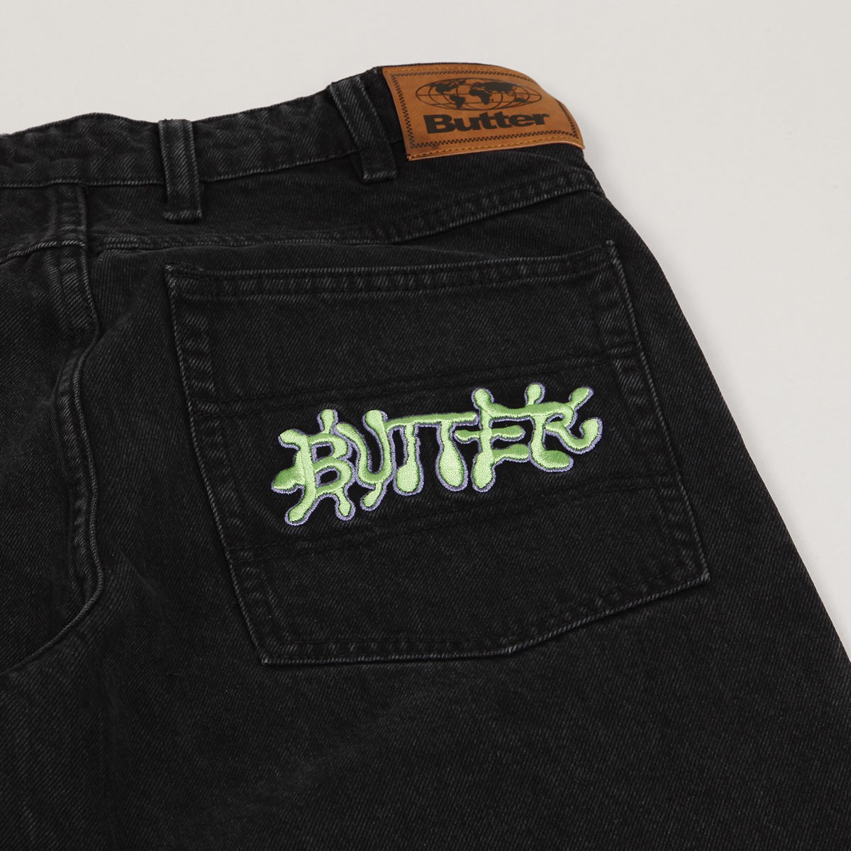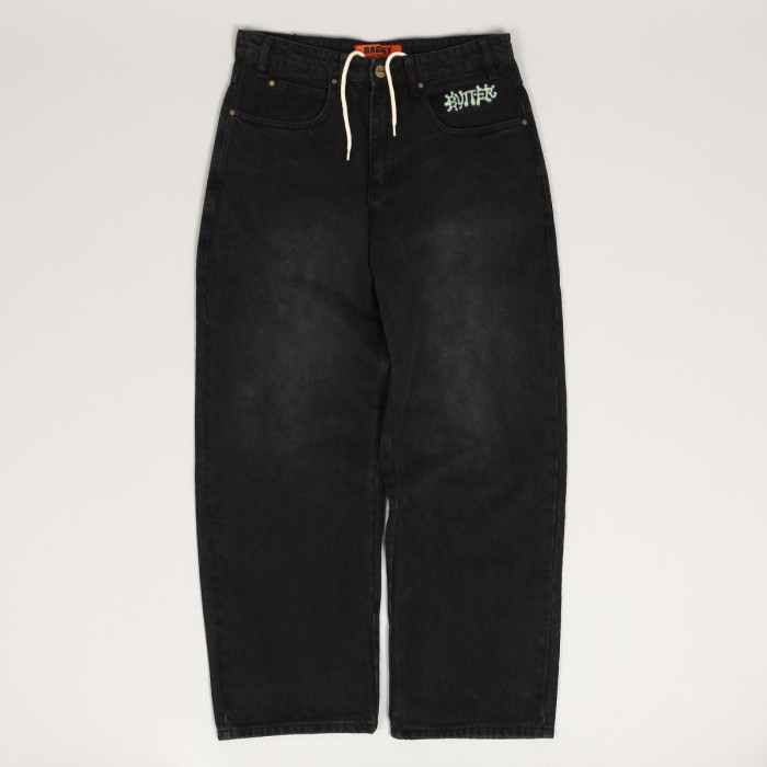 Jeanové kalhoty z kolekce australské značky Butter Goods, kterou v roce 2008 založili skateři a kamarádi Garth Mariano a Matt Evans. Model s názvem Ink Denim Pants v černé barvě má široký Baggy střih. Na levé přední a pravé zadní kapse vyšitý nápis Butter. V pase ukrytá tkanička na stahování. Na horním lemu na pravé straně obdélníková kožená nášivka s vyraženým labelem Butter.