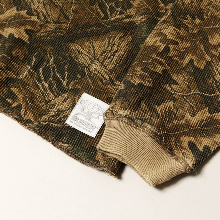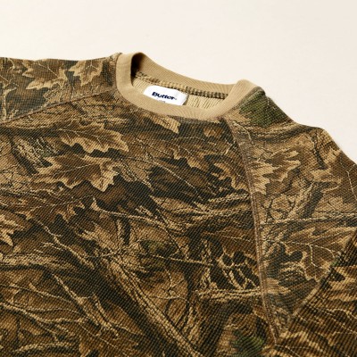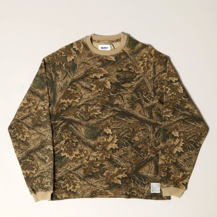 Model Waffle LS Top s dlouhým rukávem a vaflovým vzorem. Má celoplošný potisk lesního maskování s podzimním zbarvením. Na spodním levém lemu je tkaný štítek s logem Butter. Rukávy mají elastické zakončení.