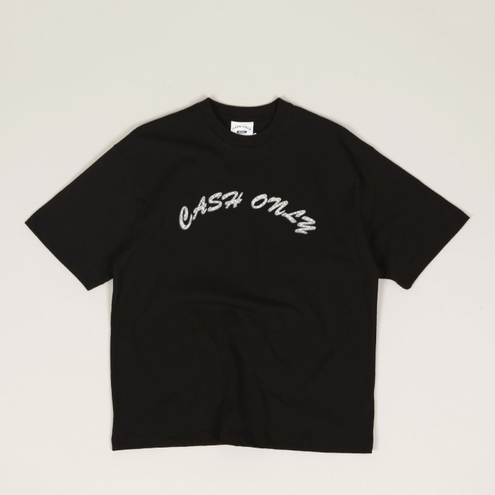 Uprostřed hrudi je potisk nápisu Cash Only, který je inspirovaný plátem diamantového plechu. Triko má kulatý výstřih a krátké rukávy.