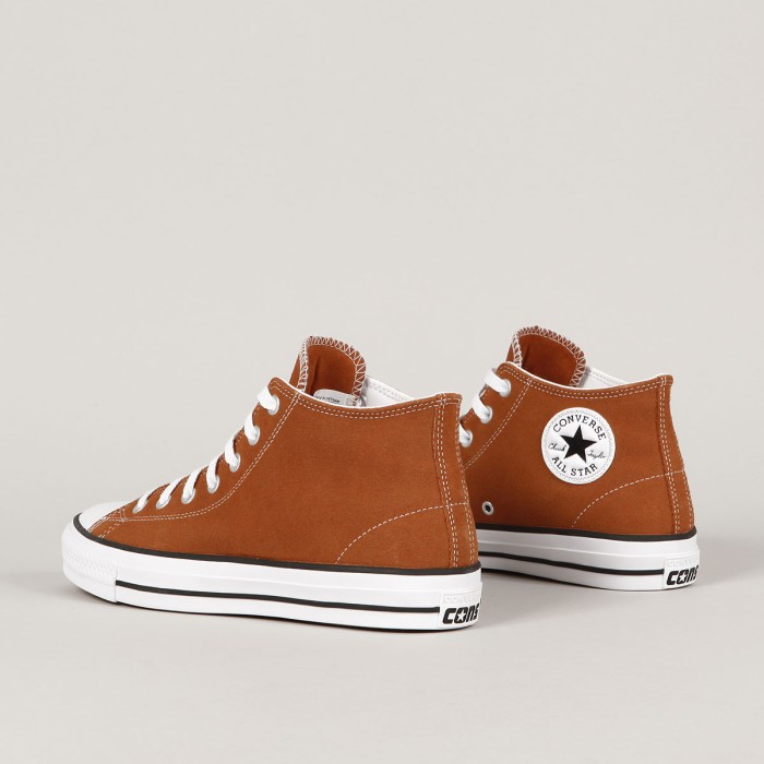 Boty Converse ze skejtové řady CONS. Model Chuck Taylor All Star Mid Pro ve světle hnědé barvě s konstrastní bílou nášivkou a bílou vulc podrážkou. Svršek vyrobený ze semiše. Lehce polstrovaný lem kolem kotníku, elastický klínek na jazyku, odolná gumová špička a vnitřní pěnová vložka z CX pěny pro měkkčí dopady a větší pohodlí. Kovová očka pro tkaničky a dvě na odvětrávání na vnitřku boty. Na boku boty nášivka Chuch Taylor All Star a na patce vyražené logo Converse Cons. V balení tkaničky navíc.