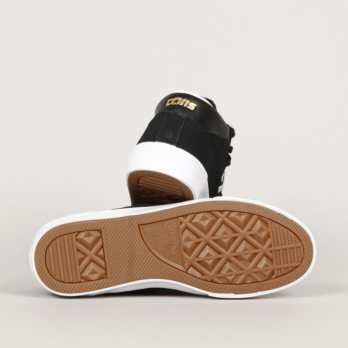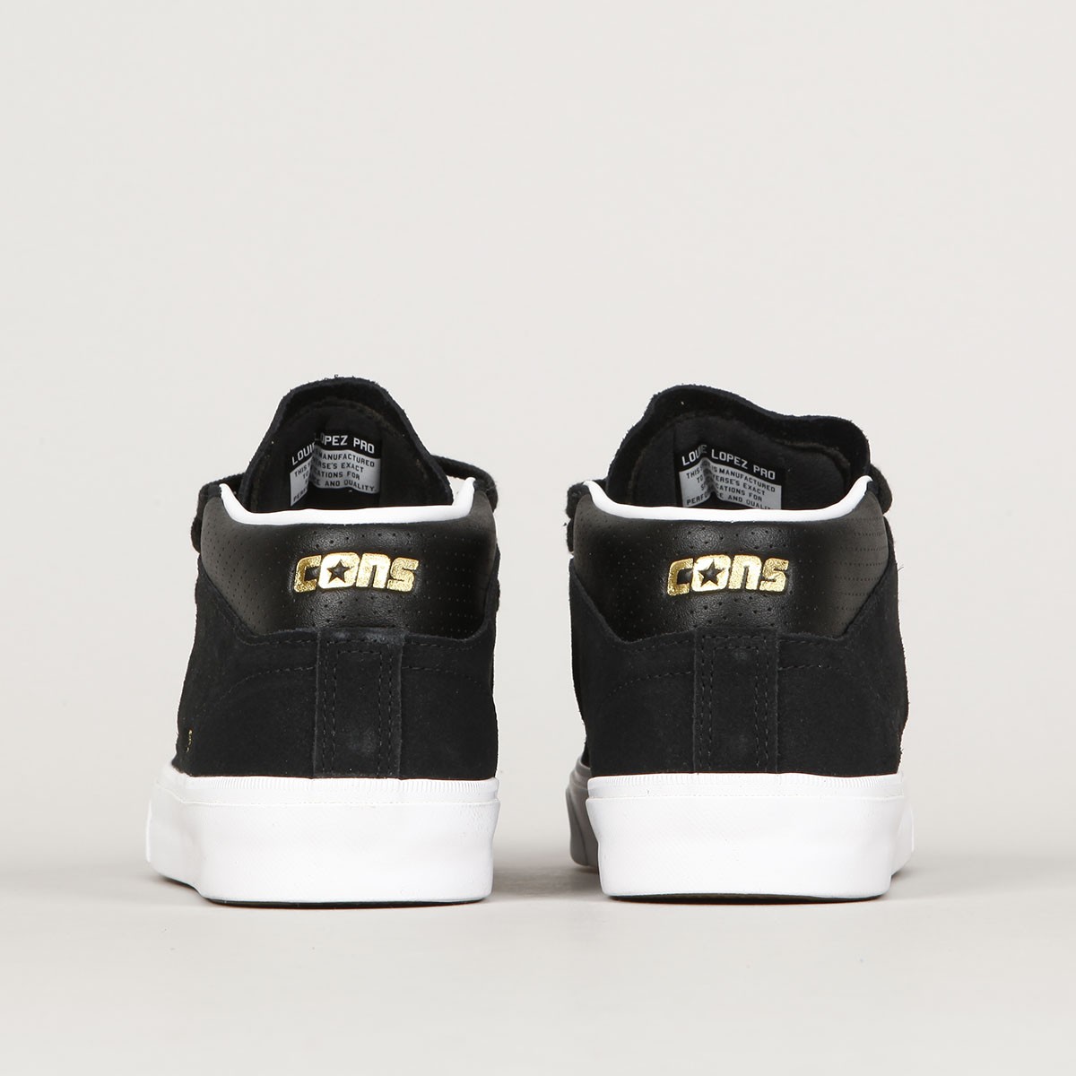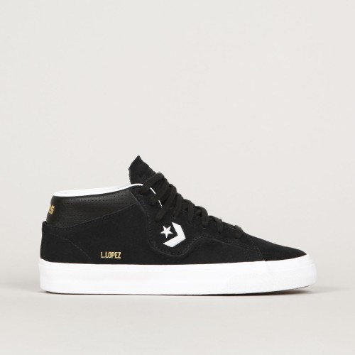 Boty Converse CONS. Pro-model Louie Lopez Pro Mid v černém provedení a vulkanizovanou bílou podrážkou. Čistá, dlouhá špička s decetním prošíváním a kožený vnitřek patky. Z boku boty je vyšité kontrastní logo Star Chevron. Vysoký polstrovaný lem ke kotníku, odolná špička a vnitřní pěnová vložka pro měkkčí dopady a větší pohodlí. Zlatý nápis L. Lopez na vnější straně bot. Na patce vyražený zlatý nápis Cons a na jazyku je pak logo Converse CONS.