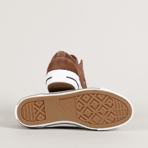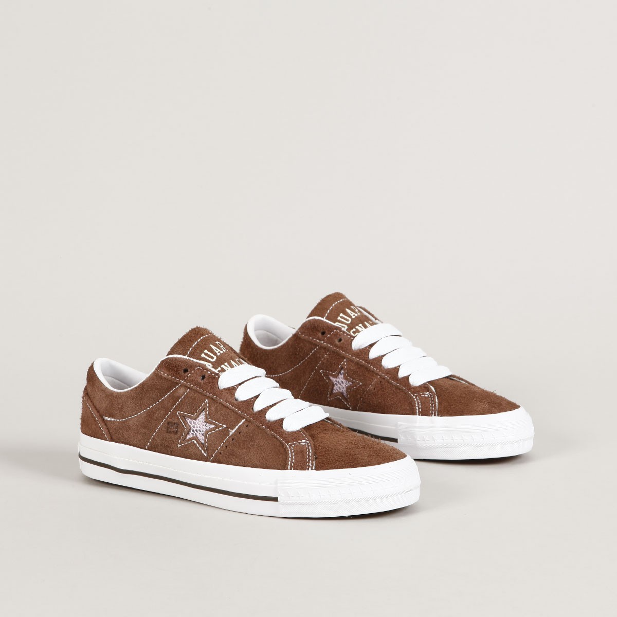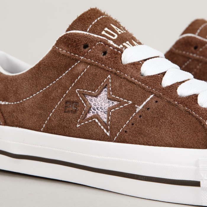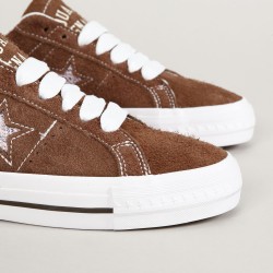 Boty Converse z limitované kolekce se značkou Quartersnacks. Model One Star Pro Dark Clove White v provedení česaného semiše s kontrastním bílým prošíváním, vulc podrážkou s logem CONS na patce a z boku boty vyšitá hvězda. Polstrovaný lem kolem kotníku, odolná špička a vnitřní pěnová vložka pro měkkčí dopady a větší pohodlí. Uvnitř elastický klínek na vystředění jazyku. Na vnější straně jazyku vyražený nápis Quartersnacks.