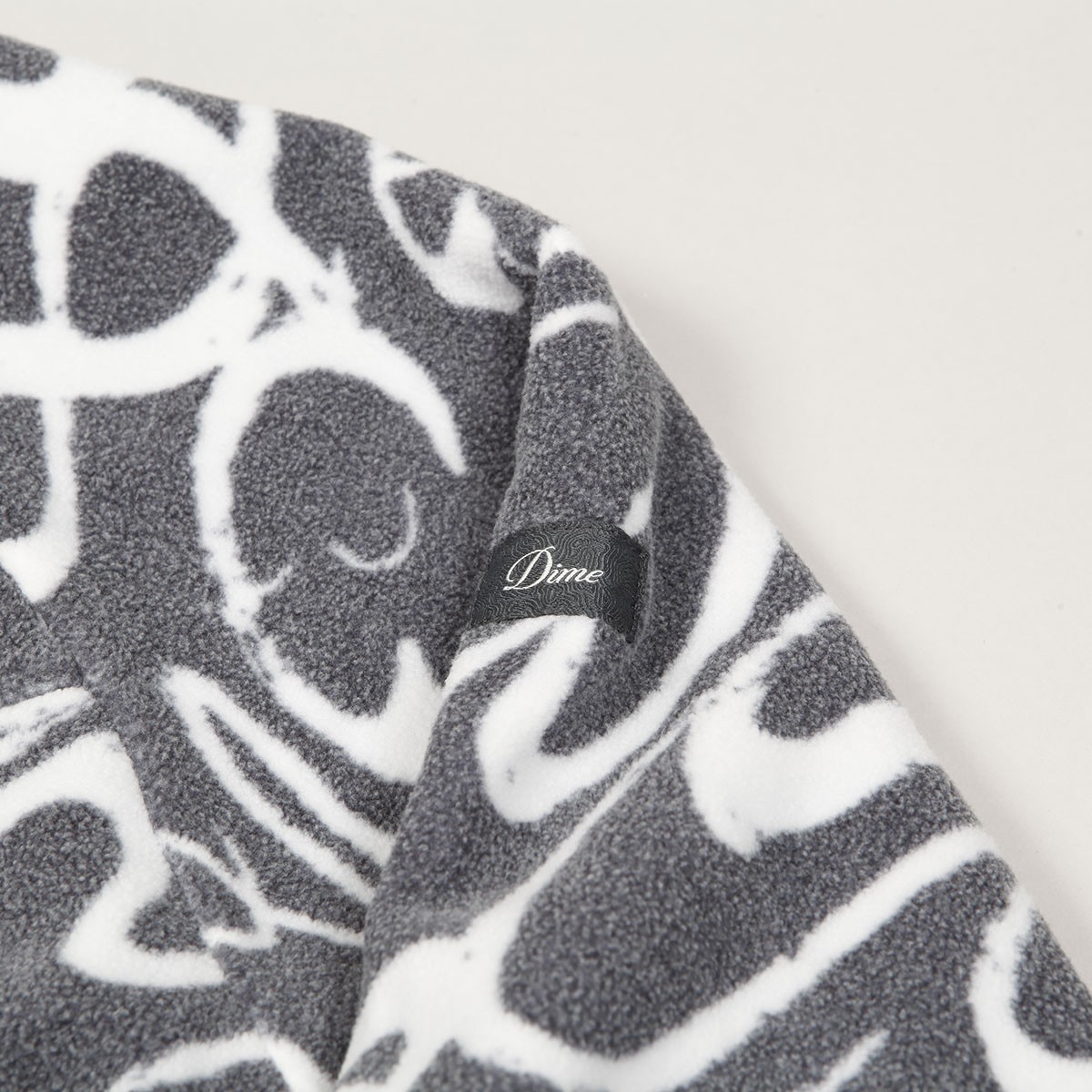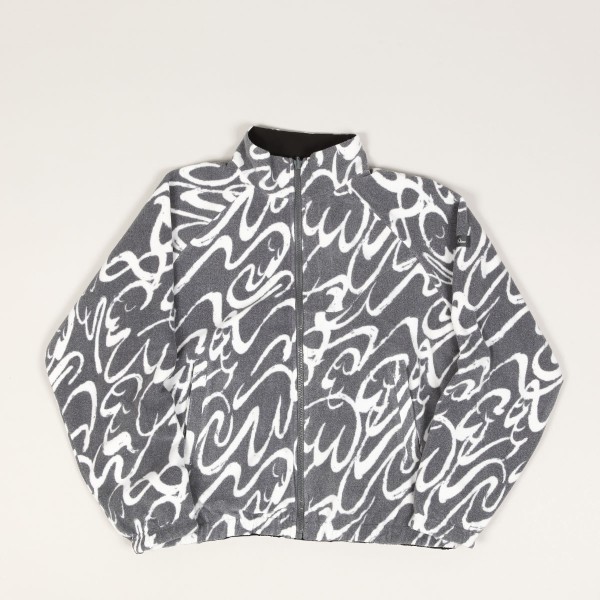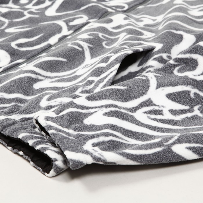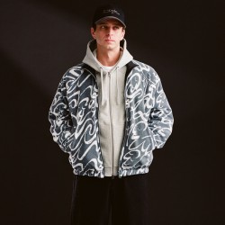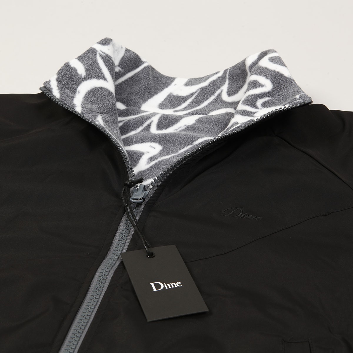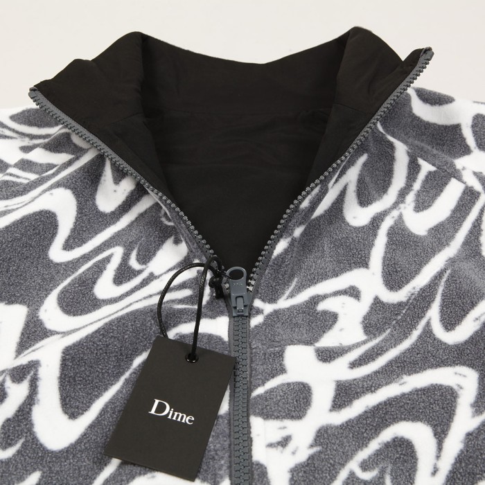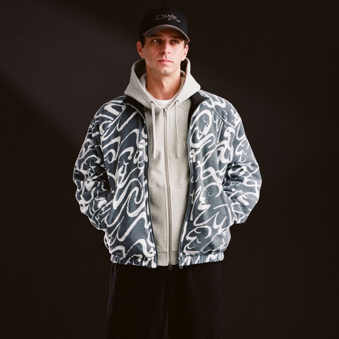 Bunda má oboustranné provedení. Z jedné strany je celoplošný motiv konstrastních vlnek a z druhé strany čistý design s decentní vlaješkou Dime a výšivkou značky na levé straně prsou.