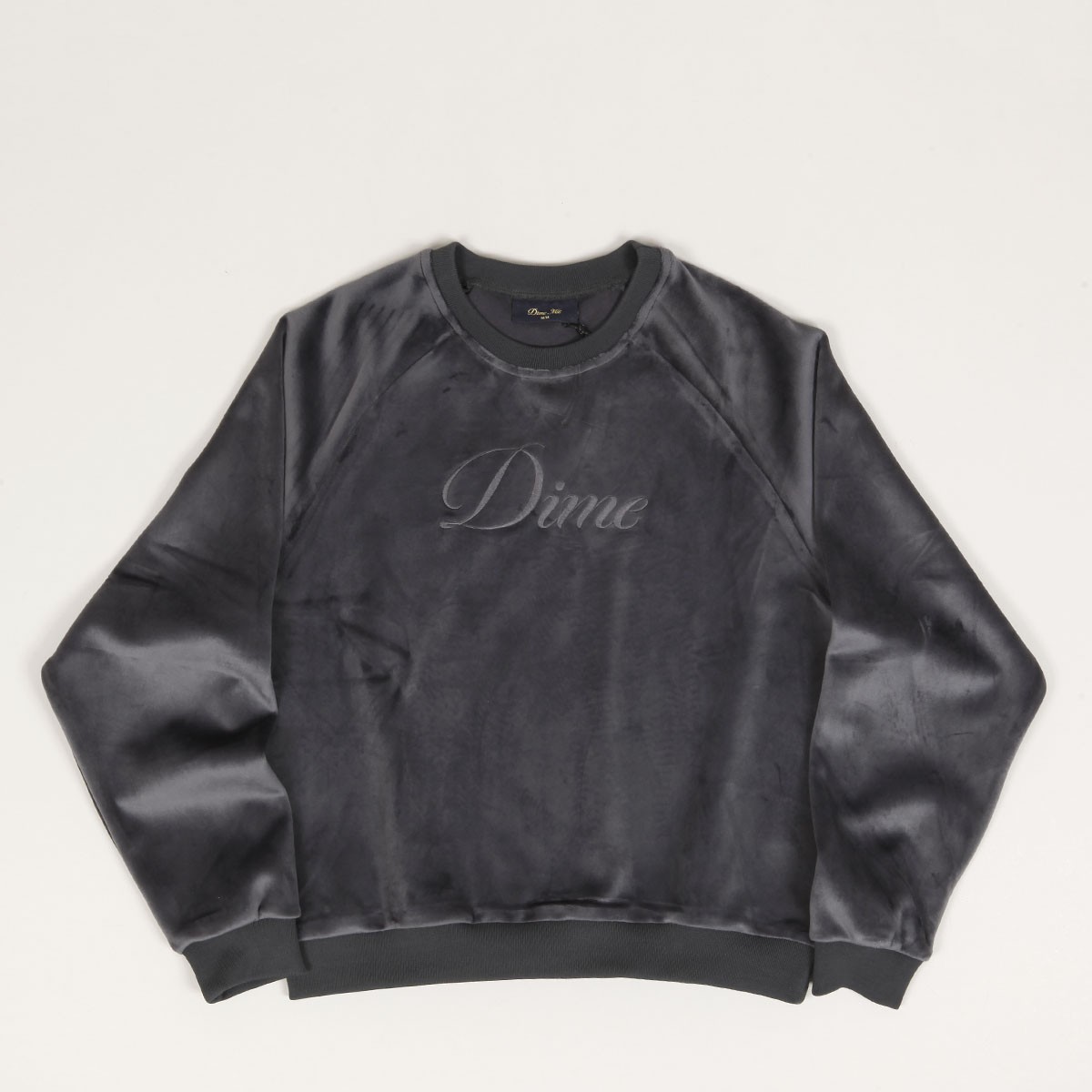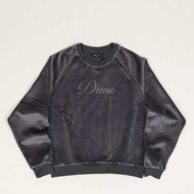 Mikina Dime s názvem Cursive Velvet Crewneck v tmavě šedé barvě kouře. Na prsou vyšité velké logo Dime. Žebrovaný límeček, zúžené, elastické rukávy a pas. Celoplošné sametové provedení, příjemné na dotek. Materiál 100% polyester.