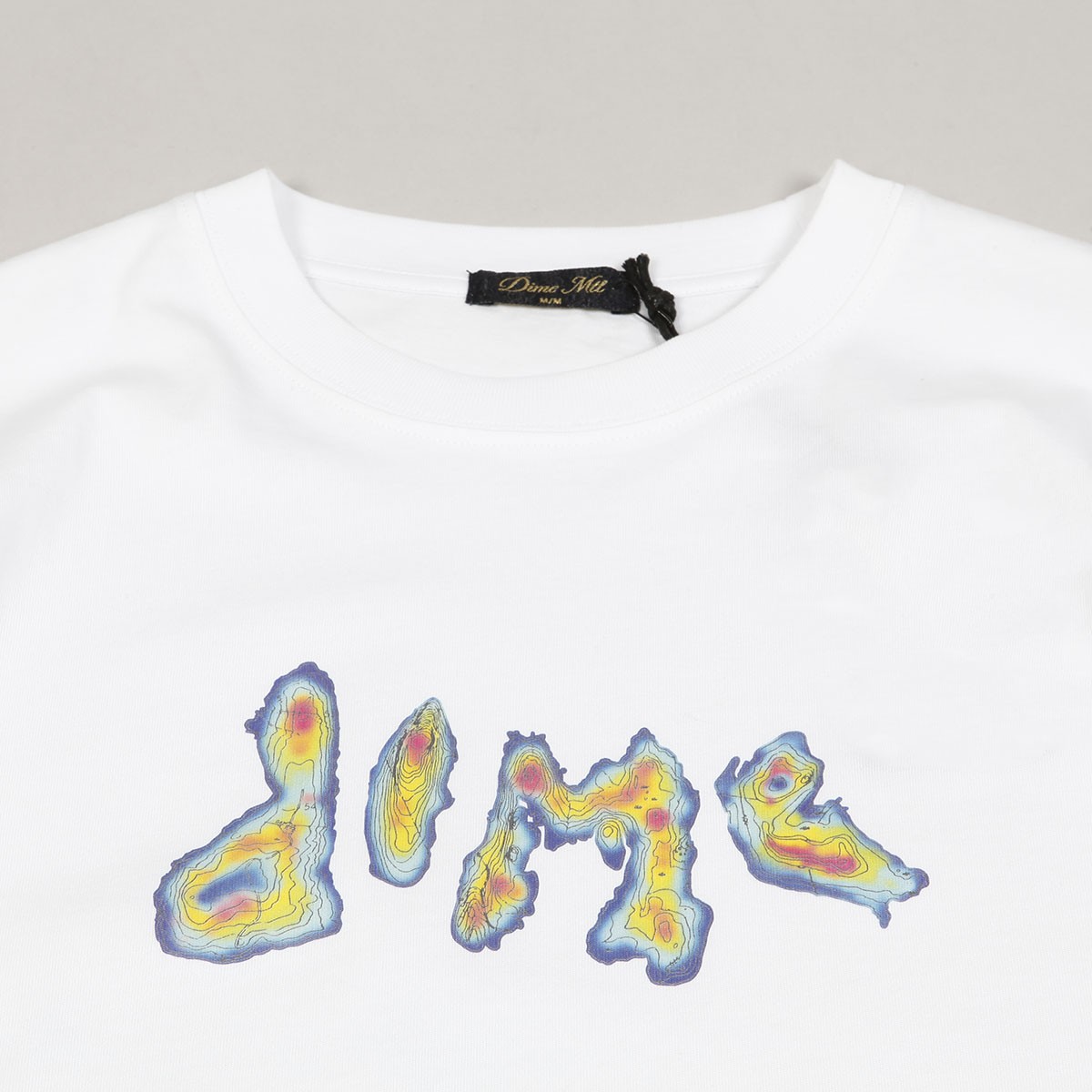 Triko Dime s názvem Topo Tee v bílé barvě. Na prsou potisk kontrastního barevného nápisu Dime. Motiv je inspirován topografickými mapami. Materiál 100% bavlna.