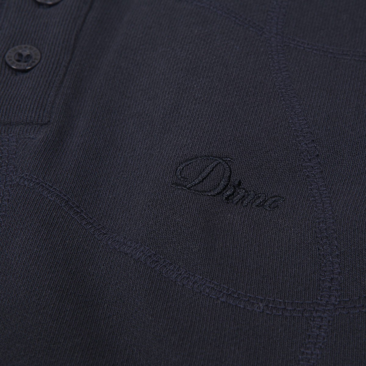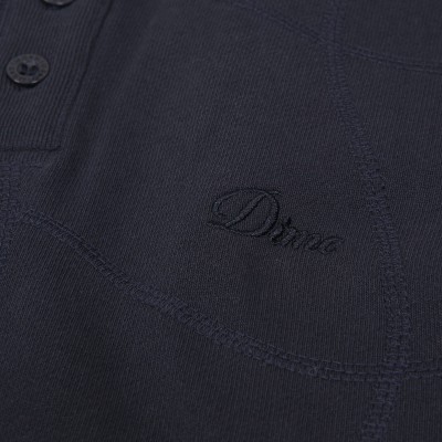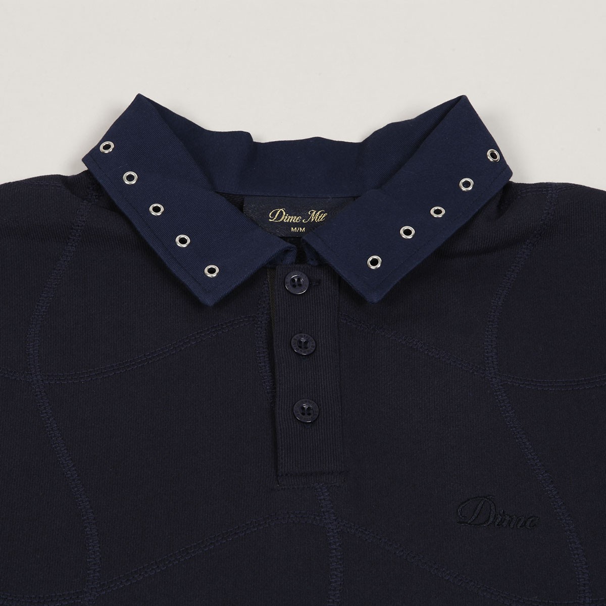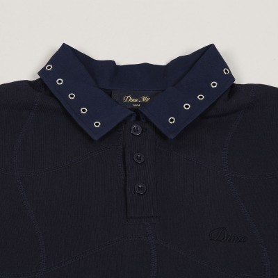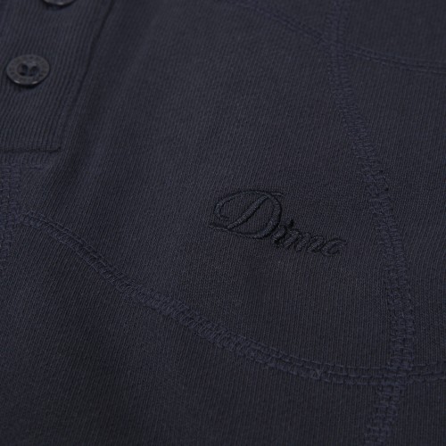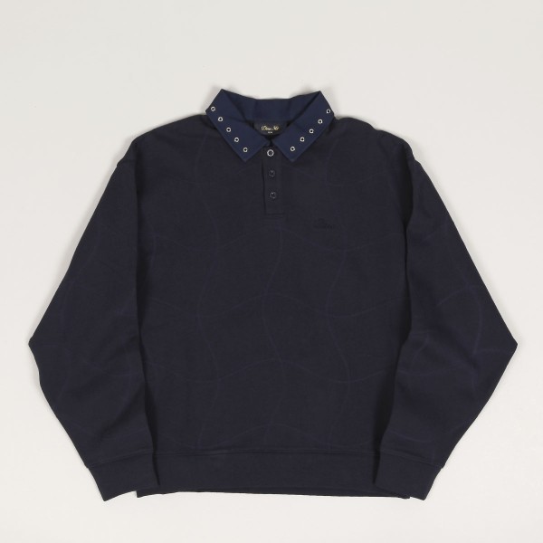 Polo triko Dime s názvem Wave Rugby v tmavě modré barvě. Dlouhé zůžené rukávy, výstřih do V se zapínáním na tři knoflíčky a vysokým přehnutým límečkem. Má celoplošný prošívaný motiv vln. Na levé straně prsou vyšitý decentní nápis Dime. Materiál 100% bavlna.