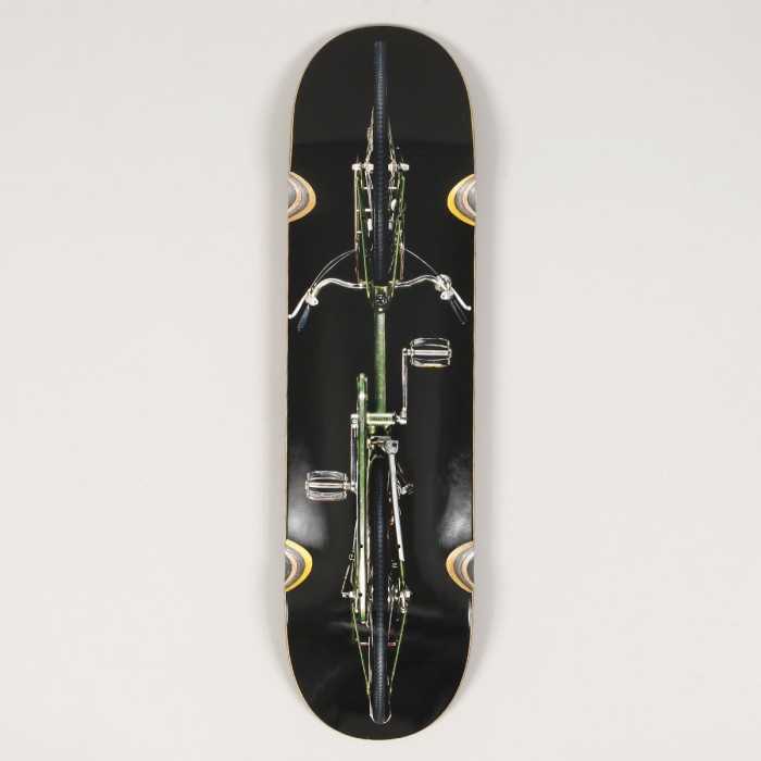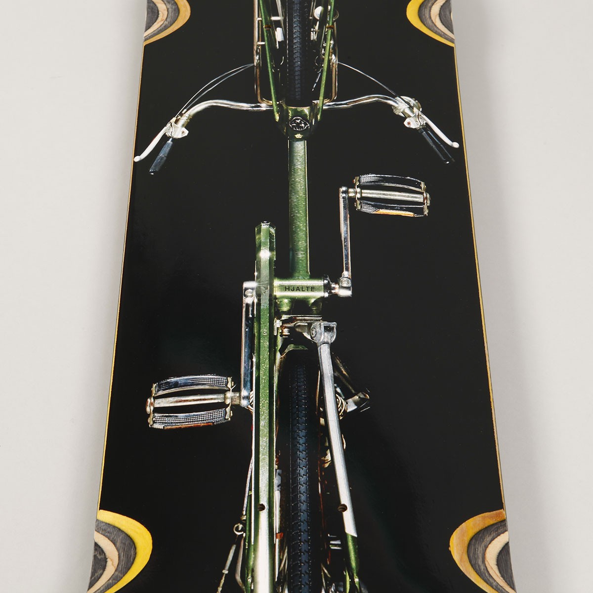 Skateboardová deska Hardbody skateboards, pro model s názvem Hjalte Bike Underneath Deck Long. Grafika spodku jízdního kola s kontrastním nápisem Hjalte. Výbrus pod kolečky pro lepší zatáčení a odjezd triků. Velikost desky je 8.25 palců, verze Long - o malinko delší než běžné desky. Ke každé desce grip zdarma. Barvená strana dřevěné desky se může lišit oproti zobrazené fotce. Vyrobeno v mexické továrně BBS.
