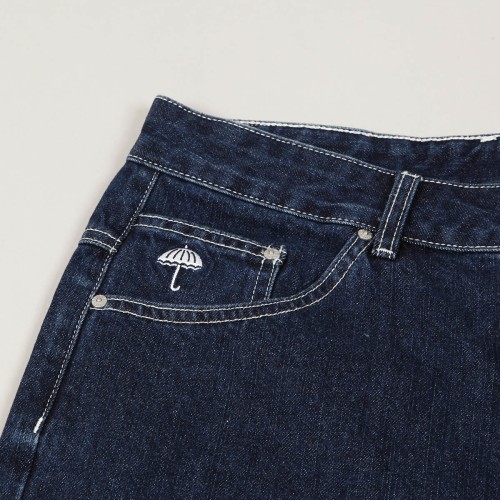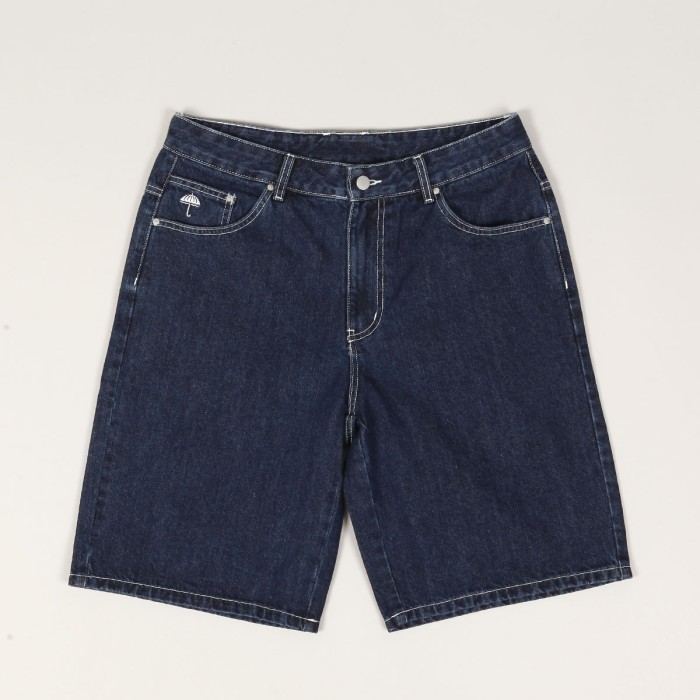 Jeanové kraťasy Hélas od francouzské značky, kterou založil skater Lucas Puig a za kterou jezdí také Roman Lišivka a Marek Zápražný. Mají volný rovný Baggy střih s prodlouženými nohaviemi. Boční a zadní kapsy na drobnosti. Zapínají se na knoflík s rytinou Hélas.