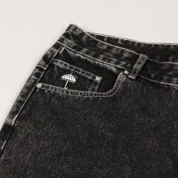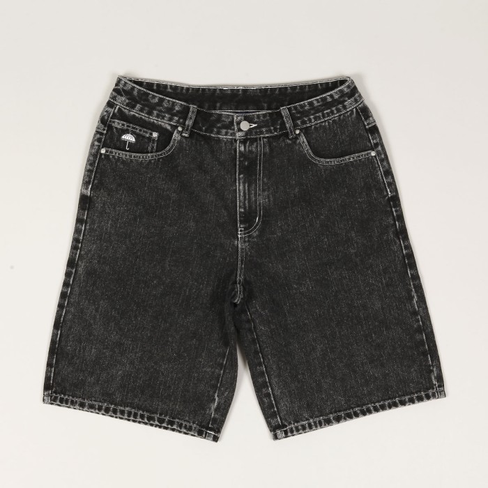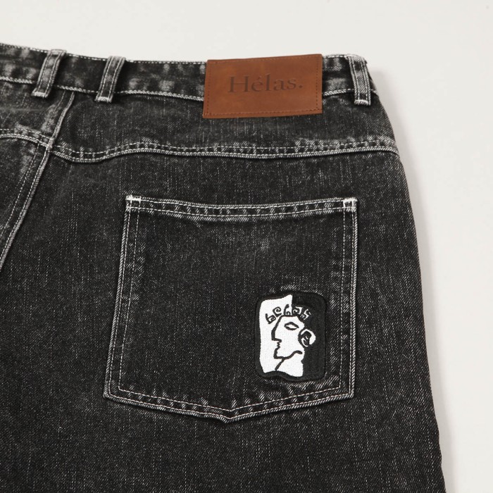 Jeanové kraťasy Hélas od francouzské značky, kterou založil skater Lucas Puig a za kterou jezdí také Roman Lišivka a Marek Zápražný. Mají volný rovný Baggy střih s prodlouženými nohaviemi. Boční a zadní kapsy na drobnosti. Zapínají se na knoflík s rytinou Hélas.