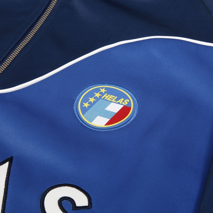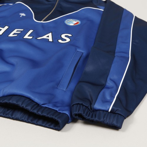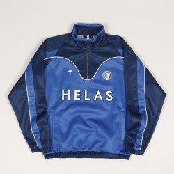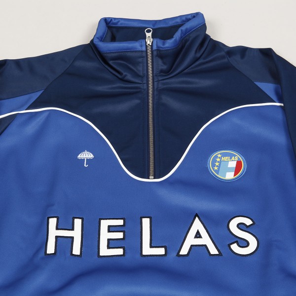 Mikina Hélas od francouzské značky, kterou založil skater Lucas Puig. Model s názvem Forza Quarter Zip Crewneck s vysokým límečkem, zapínánm na tříčtvrteční zip, zúženými rukávy a elastickým pasem. Na prsou vyšitý velký kontrastní nápis Hélas, decentní deštník a malé kulaté logo. Na břiše jsou dvě kapsy se zapínáním na zip. Vyrobeno ze 100% polyesteru. Inspirováno fotbalovými sportnovními soupravami.