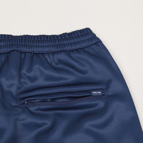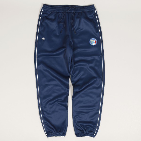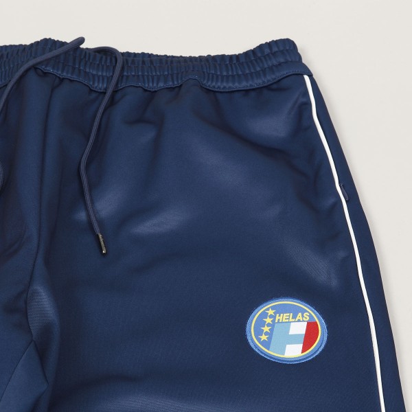 Kalhoty Hélas od francouzské značky, kterou založil skater Lucas Puig a za kterou jezdí také Roman Lišivka a Marek Zápražný. Model s názvem Forza Tracksuit Pants má na levé nohavici vyšité kulaté logo Hélas a na pravé nohavici vyšitý decentní kontrastní deštník. Elastický pas se stahováním na tkaničky a zúžené nohavice. Postranní kapsy a zadní kapsa se zapínáním na zip a malou vlaječkou značky. Vyrobeno ze 100% polyesteru. Inspirováno fobalovými sportovními soupravami.