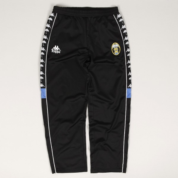 Kalhoty s motivy fotbalové sportovní soupravy. Na stehnech vyšitá logo Hélas a Kappa. Strany nohavic zdobí proužek s kontrastními logy obou značek. Designové prošití bílými linkami.