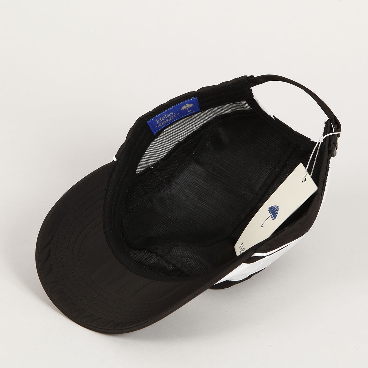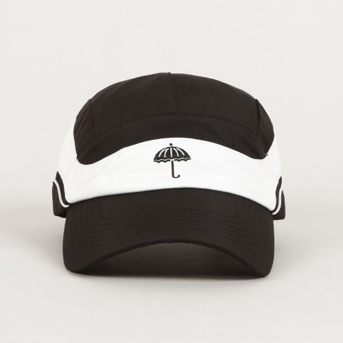 Černo bílá kšiltovka Hélas s mírně zahnutým kšiltem a vyšitým černým deštníkem na čele. Klasická pětipanelová konstrukce. Vzadu látkový pásek s plastovým jezdcem pro úpravu velikosti s decentní vlaječkou. Vyrobeno ze 100% terylenu. Inspirováno vintage tenisovou módou.