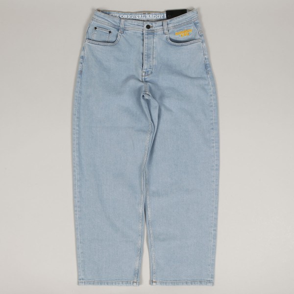 Jeanové kalhoty Homeboy s názvem X-Tra Monster Pencil Denim ve světle modré barvě. Jsou inspirovány klasickým vintage vzhledem kalhot z 90. let. Mají super široký Monster střih, vypasované boky a lehké zúžení konců nohavic. V levé přední kapse vyšitý kontrastní nápis Homeboy X-Tra. Na zadní kapse barevná výšivka nápisu Homeboy a decetní duhová vlaječka. Na horním lemu label Homeboy. Mají zapínáni na knoflíky. Vyrobeno z 99% bavlny a 1% elastanu.