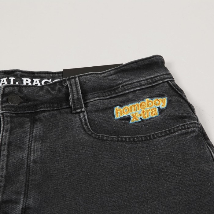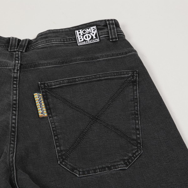 Homeboy X-Tra Monster Denim Shorts in washed grey. Inspired by the classic vintage look of 90s shorts. Wide Monster cut. Contrasting Homeboy X-Tra embroidered lettering on the left front pocket. X-stitching and a rainbow flag on the back pocket. Homeboy label on the upper hem. Button fastening. Made of 99% cotton and 1% elastane.