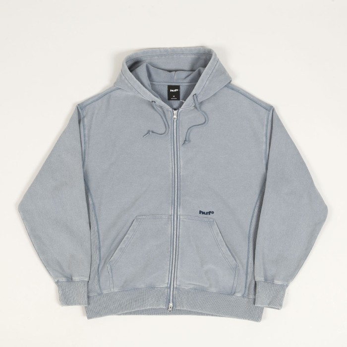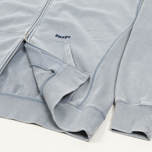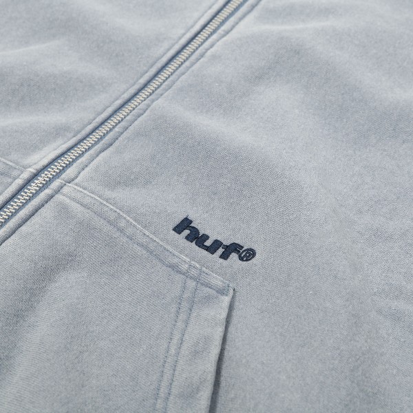 Mikina HUF s názvem Pacific Zip Hoodie. Na břiše je vyšitý decentní nápis HUF, na zádech je velké logo HUF vytvořené sepráním. Mikina je celoplošně sepraná a působí obnošeným vintage vzhledem.