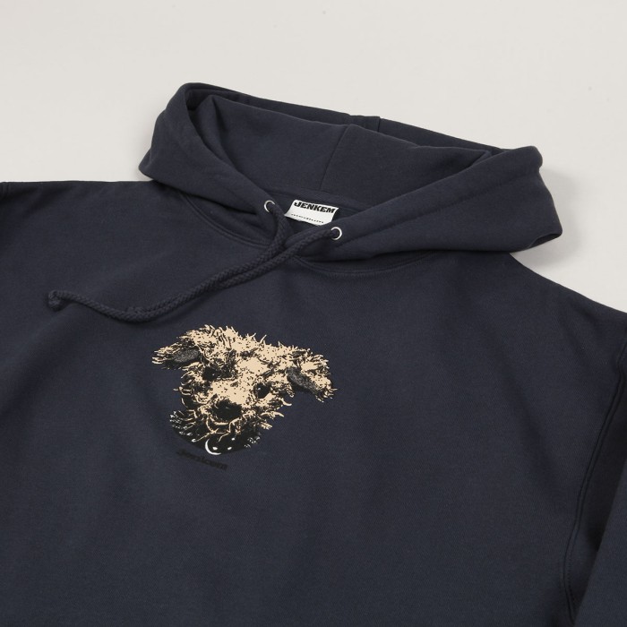 Mikina Jenkem, model s názvem Rags Hoodie v tmavě modré barvě. Mikina má stahovatelnou kapucu a velkou přední kapsu na briše. Na prsou potisk hlavy psa s nápisem Jenkem pod grafikou.