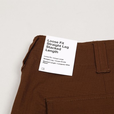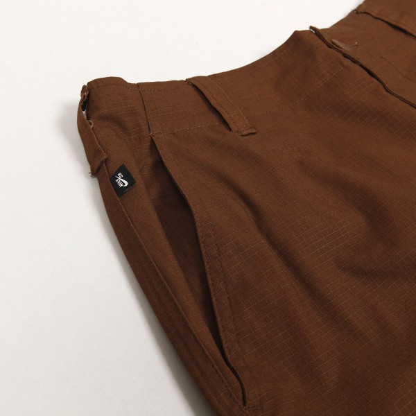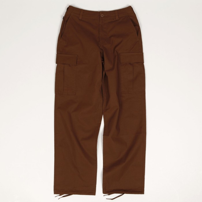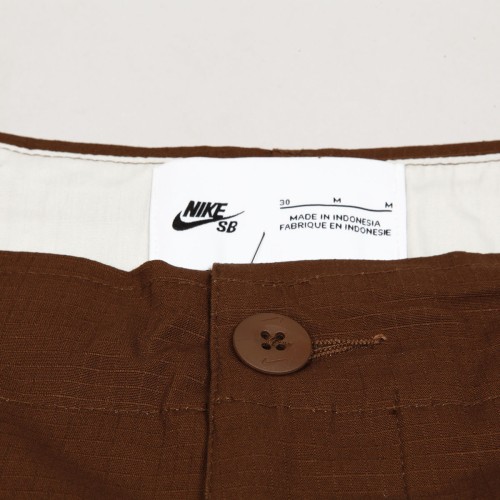 Kalhoty Nike SB, model s názvem Kearny Cargo Pants z odolného ripstopu, který je odolný a zároveň umožňuje přirozený pohyb na prkně i při běžném nošení. Zesílená sedačí část. Spousta úložného prostoru díky několika kapsám. Nohavice se stahovacími šňůrkami na lemech kotníků pro úpravu střihu. Zapínání na knoflík, poklopec na zip, uvnitř skryté stahování na tkaničku. Na levé kapse decentní výšivka fajfky Nike. Materiál 97% bavlna a 3% spandex.