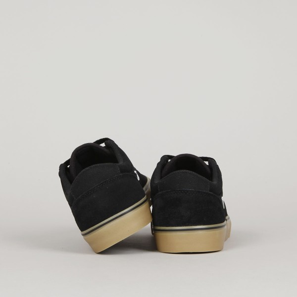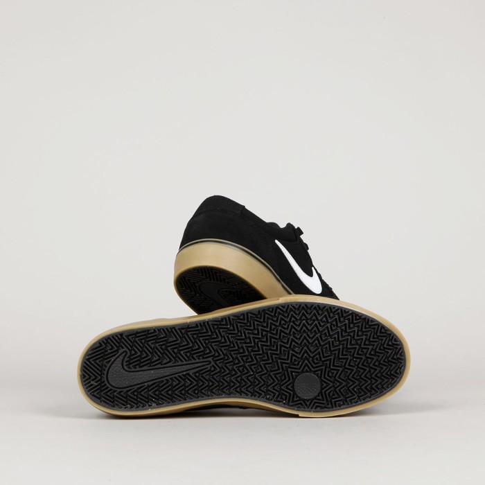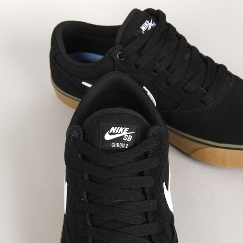 Skateboardové boty Nike SB s názvem Chron 2 v barvě Black White Gum. Svršek je vyroben z kombinace semiše a zesíleného canvasu. Tenký a prodyšný jazyk zajišťuje dostatečné proudění vzduchu. Pěna Solarsoft s dvojí hustotou pro tlumení dopadů a podrážka se hvězdičkovým vzorem poskytují vynikající přilnavost a kontakt s prknem. Horní očka jsou kovová. Na boku našitý swoosh a na jazyku logo Nike SB.