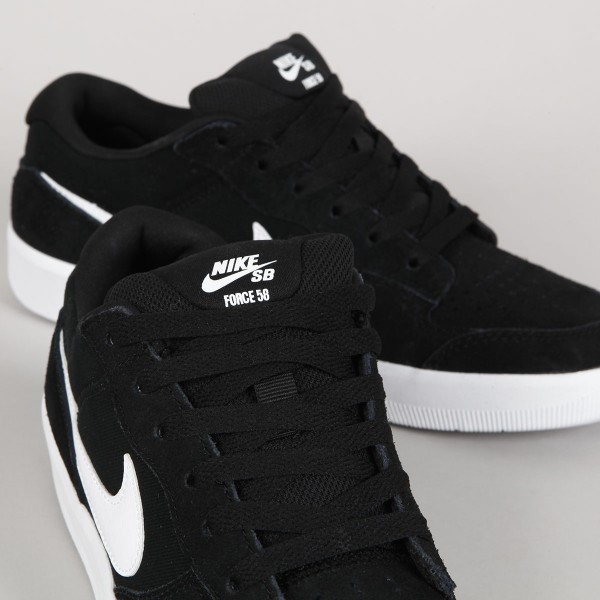 Boty Nike Skateboarding, nový model Force 58 v klasickém barevném provedení Black White. Jsou inspirovány basketbalovými botami. Svršek vyroben z semiše a canvasu, perforovaná špička pro lepší prodyšnost, podrážka kombinuje odolnost Cupsole a pružnost vulkanizované konstrukce. Vzorek Tri-Star při došlápnutí rozptyluje tlak a přiléhá tak lépe k povrchům. Na boku boty a špičce ikonický swoosh. Na patce je vyražené logo Nike SB. Signatura loga Nike na jazyku a vnitřní stélce.
