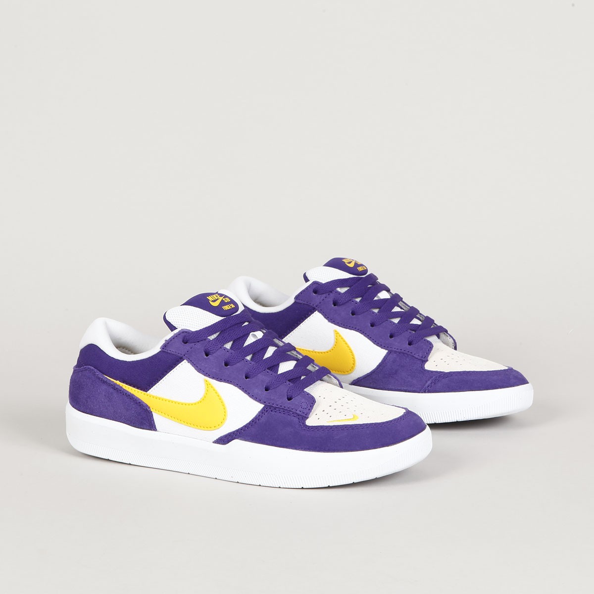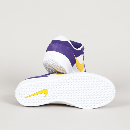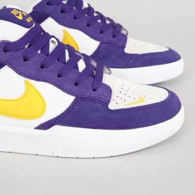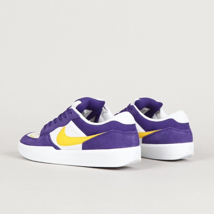 Boty Nike Skateboarding, nový model Force 58 v barevném provedení Court Purple Amarillo White. Jsou inspirovány basketbalovými botami. Svršek vyroben z semiše a canvasu, perforovaná špička pro lepší prodyšnost, podrážka kombinuje odolnost Cupsole a pružnost vulkanizované konstrukce. Vzorek Tri-Star při došlápnutí rozptyluje tlak a přiléhá tak lépe k povrchům. Na boku boty a špičce ikonický swoosh. Na patce je vyražené logo Nike SB. Signatura loga Nike na jazyku a vnitřní stélce.