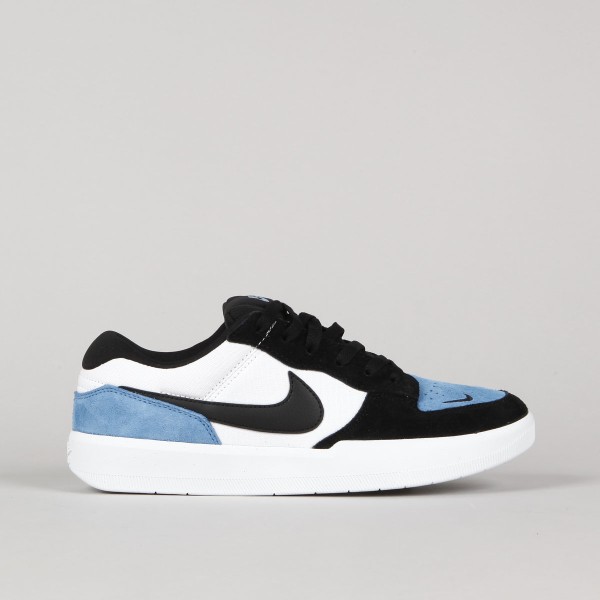 Boty Nike Skateboarding, nový model Force 58 v barevném provedení Dutch Blue/ Black- White. Jsou inspirovány basketbalovými botami. Svršek vyroben z semiše a canvasu, perforovaná špička pro lepší prodyšnost, podrážka kombinuje odolnost Cupsole a pružnost vulkanizované konstrukce. Vzorek Tri-Star při došlápnutí rozptyluje tlak a přiléhá tak lépe k povrchům. Na boku boty a špičce ikonický swoosh. Na patce je vyražené logo Nike SB. Signatura loga Nike na jazyku a vnitřní stélce.
