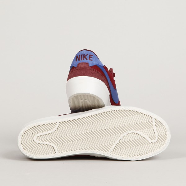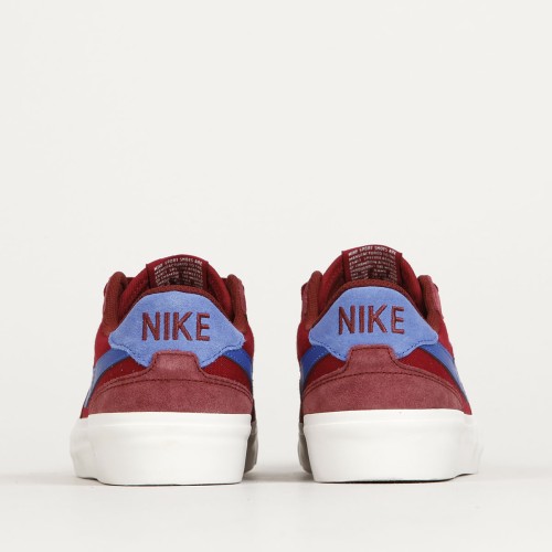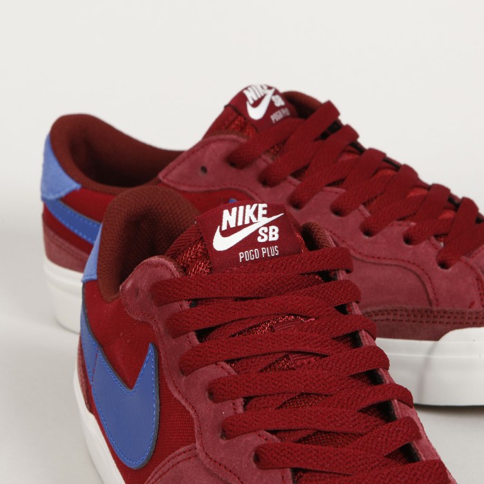 Boty Nike Skateboarding a nový model Pogo Plus v barevném provedení Team Red/ Hyper Royal - Dark Team Red. Svršek vyroben z kombinace semiše a zesíleného canvasu, vrstvená prošívaná špička, vulc podrážka s klasickým stromečkovým vzorem a zvýšeným lemem na špičce. Uvnitř vožka se systémem Zoom Air pod patou pro tlumení nárazů a větší pohodlí. Na boku boty a špičce ikonický swoosh. Na patce je vyšité logo Nike, signatura loga Nike SB je také na jazyku.