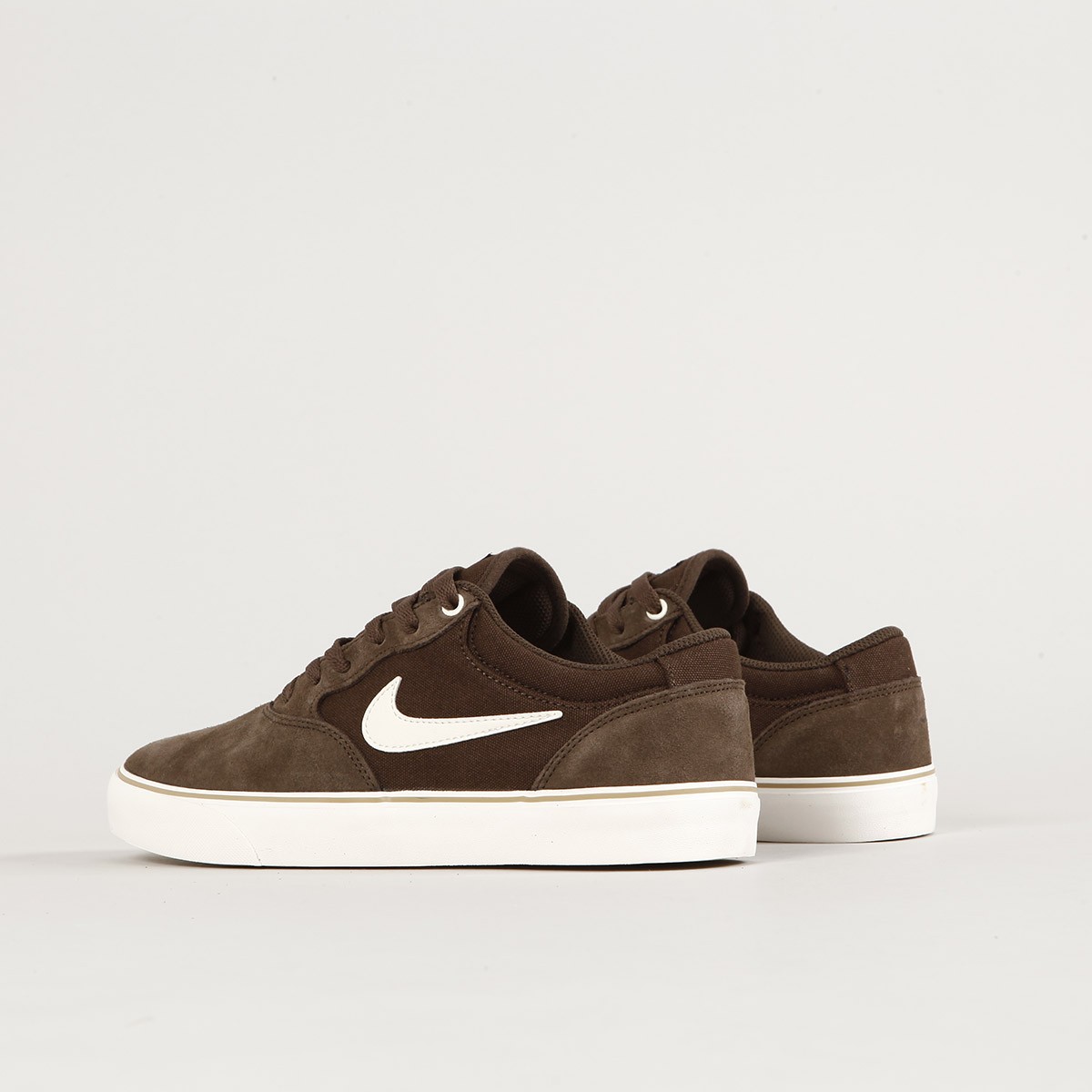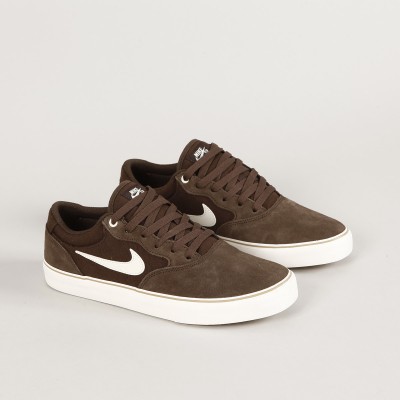Skateboardové boty Nike SB s názvem Chron 2 v barvě Baroque Brown Pale Ivory. Svršek je vyroben z kombinace semiše a zesíleného canvasu. Tenký a prodyšný jazyk zajišťuje dostatečné proudění vzduchu. Pěna Solarsoft s dvojí hustotou pro tlumení dopadů a podrážka se hvězdičkovým vzorem poskytují vynikající přilnavost a kontakt s prknem. Horní očka jsou kovová. Na boku našitý swoosh a na jazyku logo Nike SB.