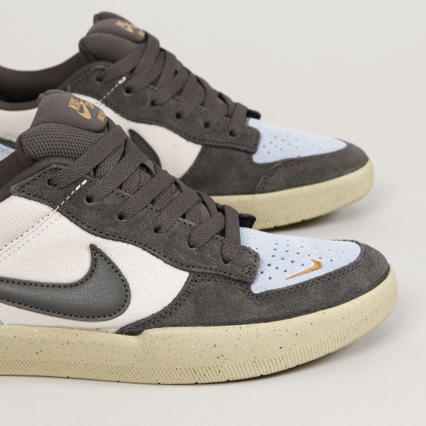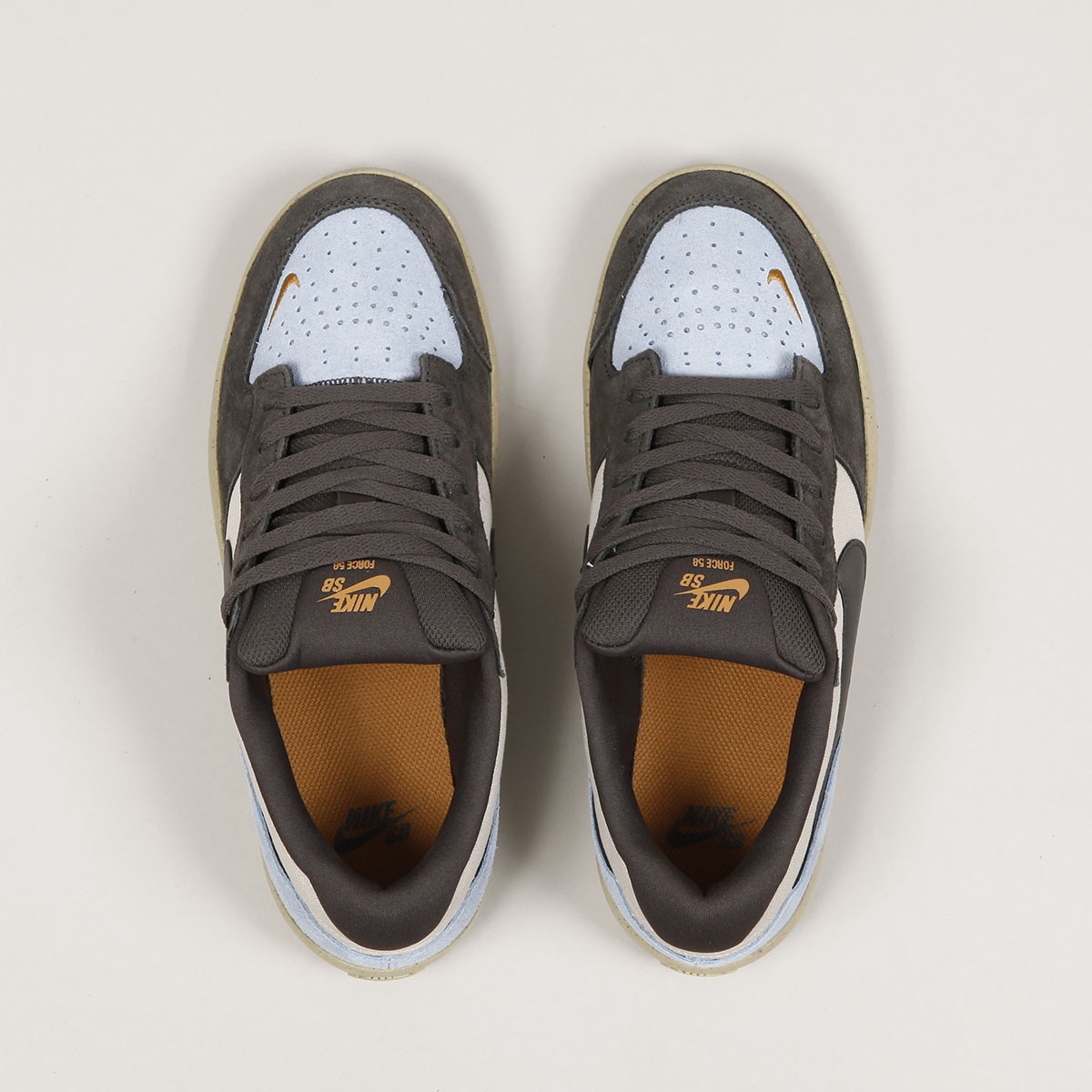 Boty Nike Skateboarding, nový model Force 58 v barevném provedení Light Orewood Brown/ Medium Ash - Psychic Blue. Jsou inspirovány basketbalovými botami. Svršek vyroben ze semiše a canavsu, perforovaná špička pro lepší prodyšnost, podrážka kombinuje odolnost Cupsole a pružnost vulkanizované konstrukce. Vzorek Tri-Star při došlápnutí rozptyluje tlak a přiléhá tak lépe k povrchům. Na boku boty a špičce ikonický swoosh. Na patce je vyražené logo Nike SB. Signatura loga Nike na jazyku a vnitřní stélce.