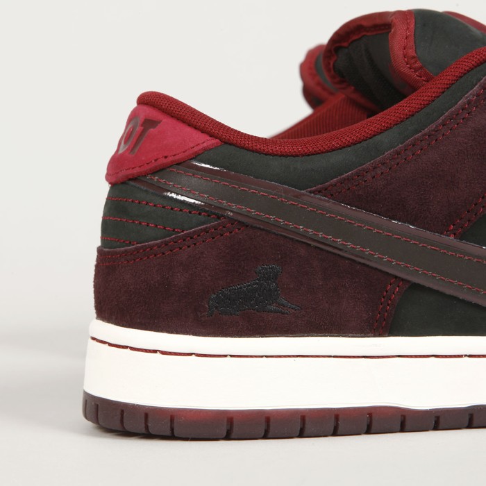 Načasování je důležité a ve vinařském umění to platí dvojnásob. Od roku 2004 pěstuje Riot Skateshop ve francouzském Bordeaux spojení mezi starosvětským řemeslem a kulturou skateboardingu. Nike SB x Riot Dunk Low Pro se inspirují hrdým městem, jehož regionální estetika z bohaté vinařské historie Bordeaux je známa po celém světě. Použitím mahagonového semišového svršku s tmavě červenými tóny a černými semišovými podklady odhaluje průsvitná červeně tónovaná podrážka modelu Riot Dunk Low poctu hroznům, které vytvářejí nezaměnitelný chuťový profil Bordeaux. Téma vína pokračuje gradientní korkovou grafikou na vnitřní vložce, logy s voskovanými pečetěmi na jazyku a vyraženým logem na patě. Jako závěrečnou tečku nabízí Riot Dunk Low odkaz na svého zesnulého psího strážce obchodu s vyšitým logem na patě.