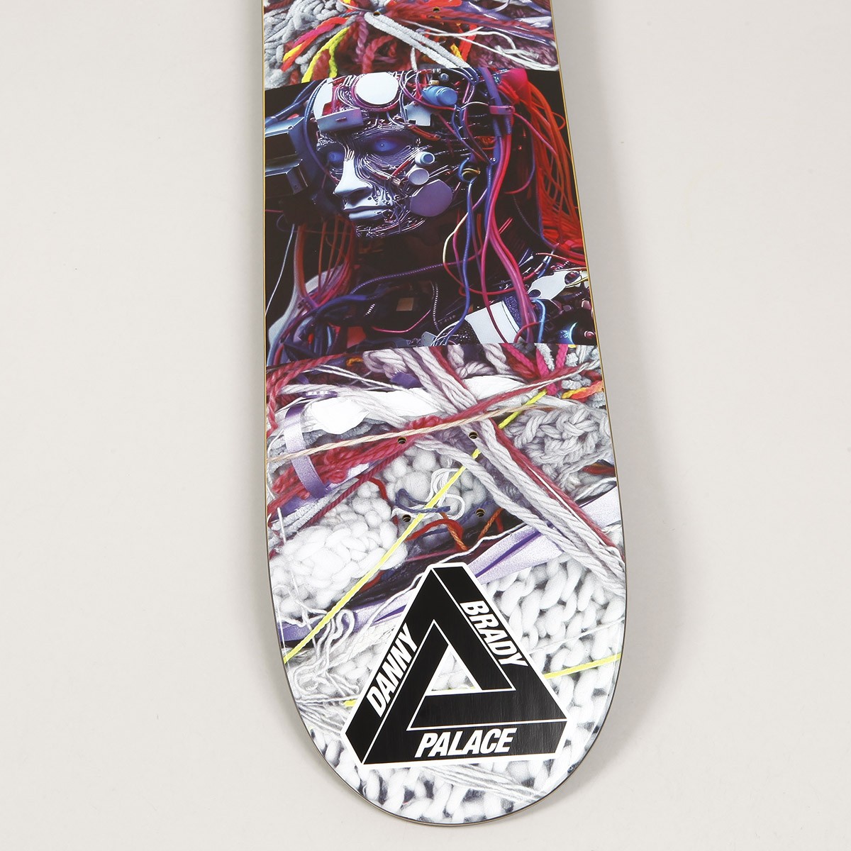 Pro model Danny Brady Pro Android Deck ve velikosti 8.0 palců s grafikou ženského androida a pozadím s barevnými pletacími přízemi. Na patce logo Palace. Ke každé desce grip zdarma. Vrchní strana desky Palace má motiv mříží.