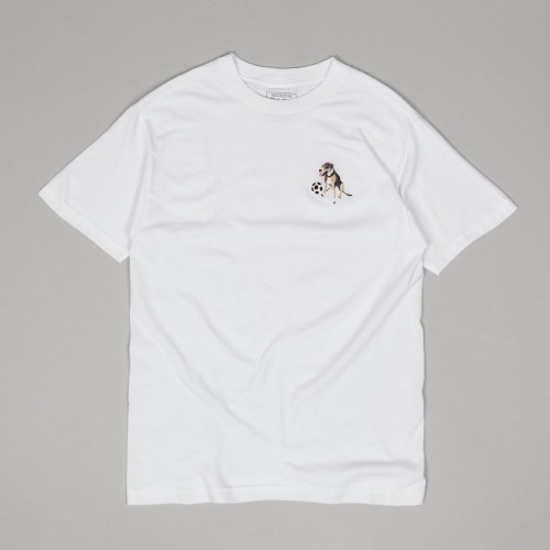 Triko Pass Port s názvem Bobby Embroidery Tee v bílé barvě. Na levé straně prsou vyšitý obrázek psa s fotbalovým míčem. Vyrobeno v Mexiku ze 100% bavlny. Značka Pass Port byla založena Trentem Evansem v roce 2009, jako oživení vycházejících Australských skate brandů.
