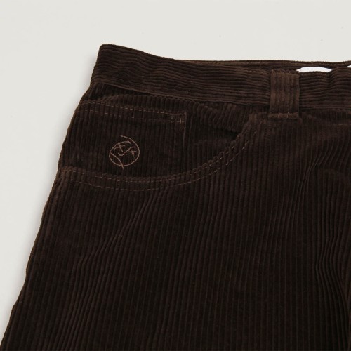 Manšestrové kalhoty Polar Skate Co. s názvem Big Boy Cords v tmavě hnědé barvě. Mají široký retro střih s širokými nohavicemi. Zapínáni na zakrytý zip a knoflík. V pravé kapse nášivka smajlíka. Vyrobeno ze 100% bavlny, 435 g. Vyrobeno v Portugalsku.