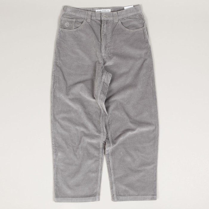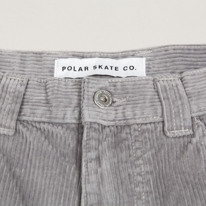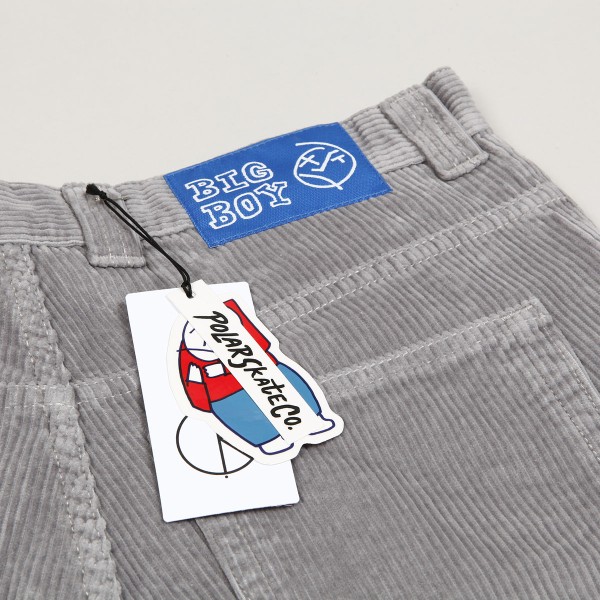 Manšestrové kalhoty Polar Skate Co. s názvem Big Boy Cords ve stříbrno šedé barvě. Mají široký retro střih s širokými nohavicemi. Zapínáni na zakrytý zip a knoflík. V pravé kapse nášivka smajlíka. Vyrobeno ze 100% bavlny, 435 g. Vyrobeno v Portugalsku.