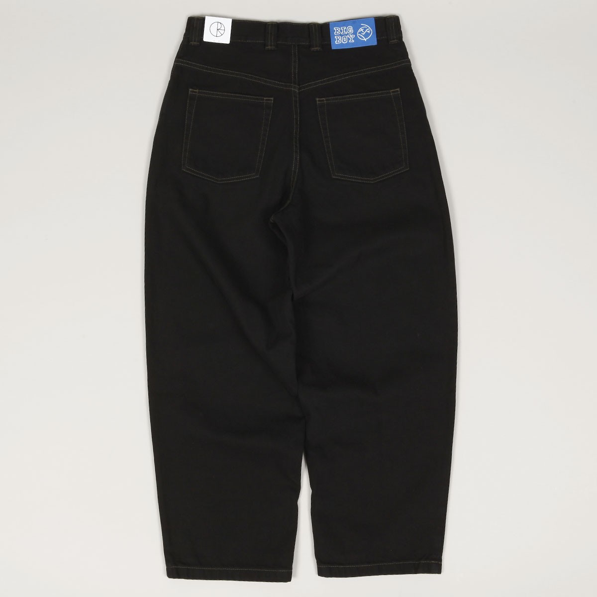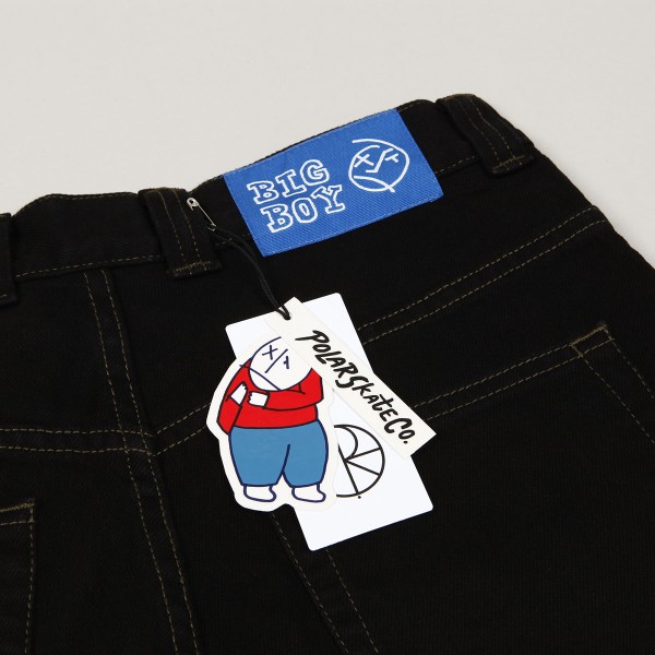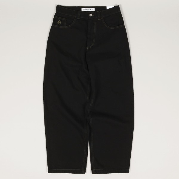 Kalhoty Polar Skate Co. s názvem Big Boy Jeans v černé barvě s lehkým nádechem olivově zelené. Mají široký retro střih s širokými nohavicemi a sníženým sedem. Zapínáni na zakrytý zip a knoflík. V pravé kapse nášivka smajlíka. Vyrobeno ze 100% bavlny, 435 g. Vyrobeno v Polsku.